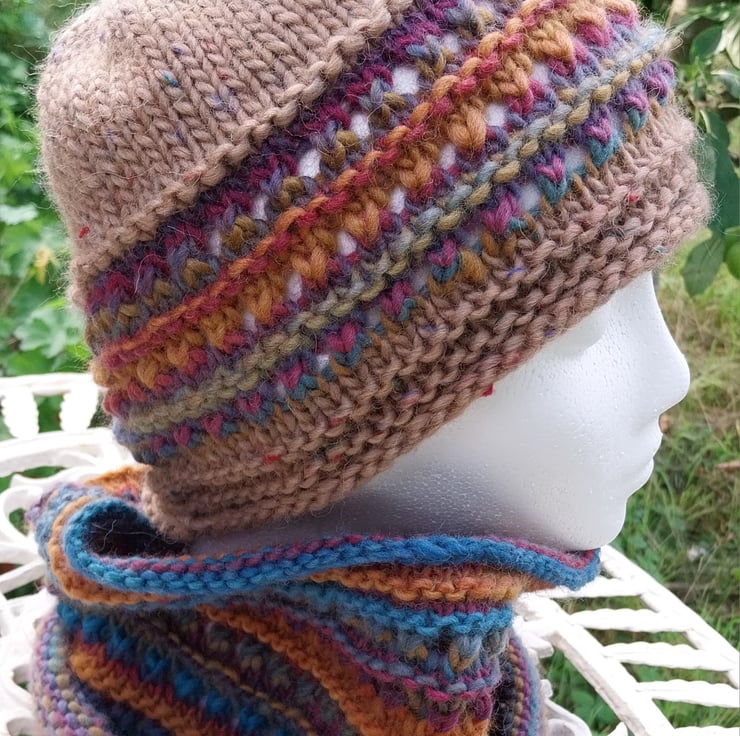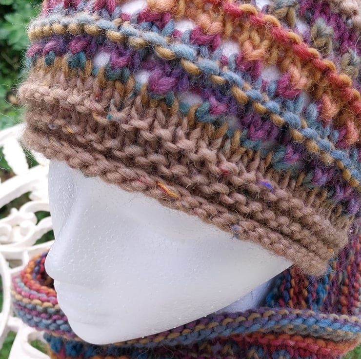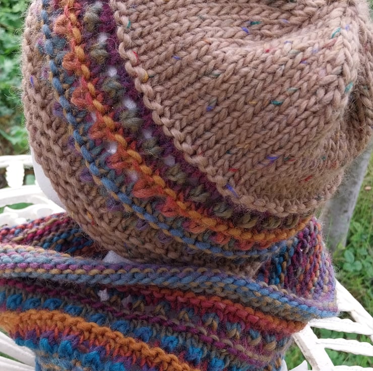 The set is made from a multicoloured 100% Wool and the plain colour contrast on the hat is a gorgeous, soft, chunky merino from Sublime.