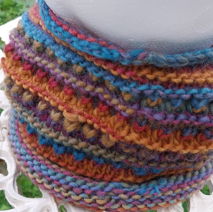 The circular cowl is approx 20cm deep and 58cm in the round.
