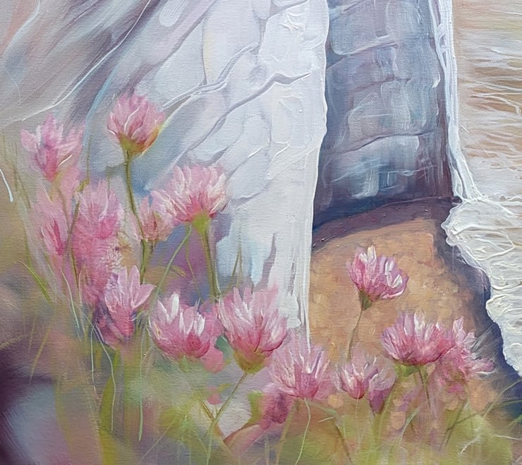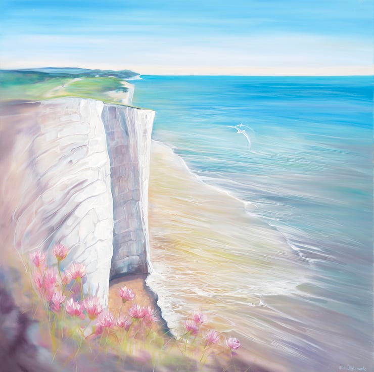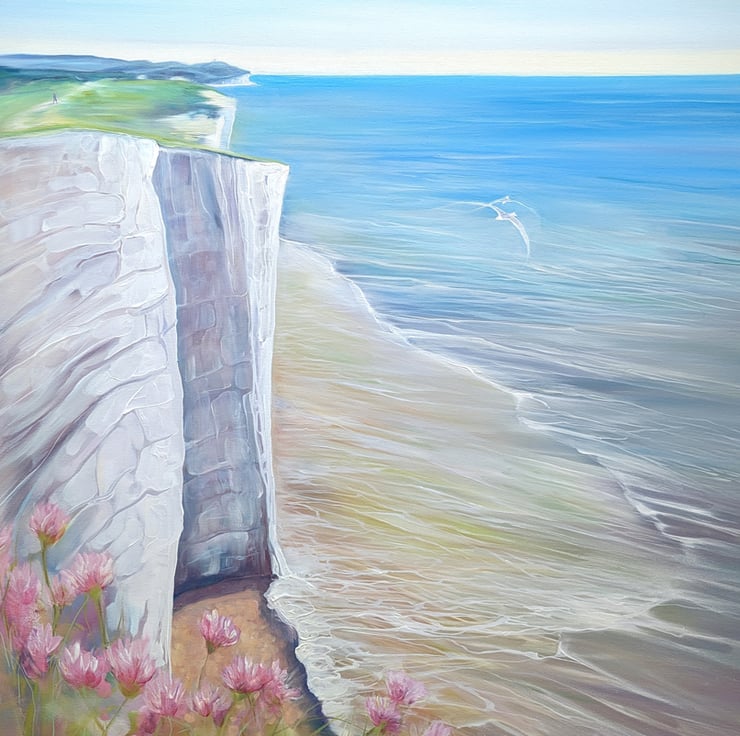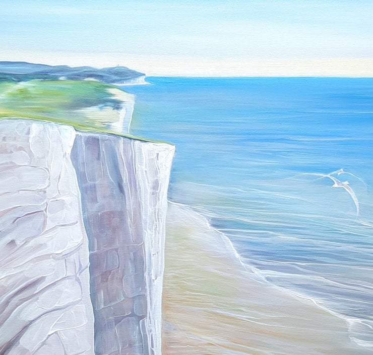 Seaford Seascape is a painting of the view from a cliff on the Sussex coast near Seaford. Two kittiwake seagulls fly across the sea and they are significant as this area is where they nest and are protected. The cliffs on the left are painted on thick textured paint to give the feeling of the chalk they are made of and in the background in the distance you can just see the Belle Tout lighthouse. The sea below the cliff is shallow and reflects the colours of the blue and turquoise sky and the coloured sand and rocks below it. The painting was inspired by the first walk I took out during the covid lockdown in March 2020. It was deserted (not sure why as exercise was allowed) and the South Downs path which you can see winding across the top of the cliffs was empty. It was a beautiful clear sunny day and I was torn between loving having it all to myself and wishing others were also there to walk it. I wanted a record of this day and this is it.