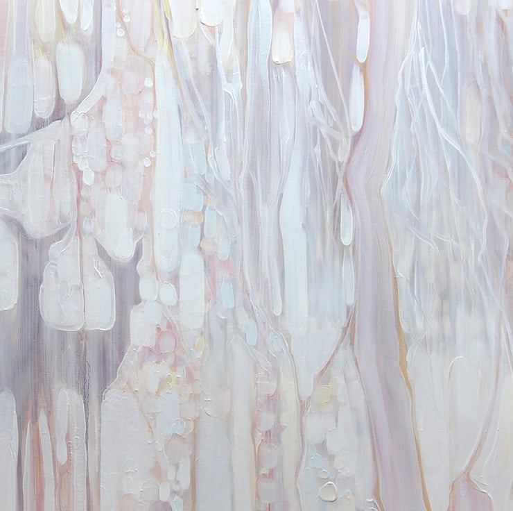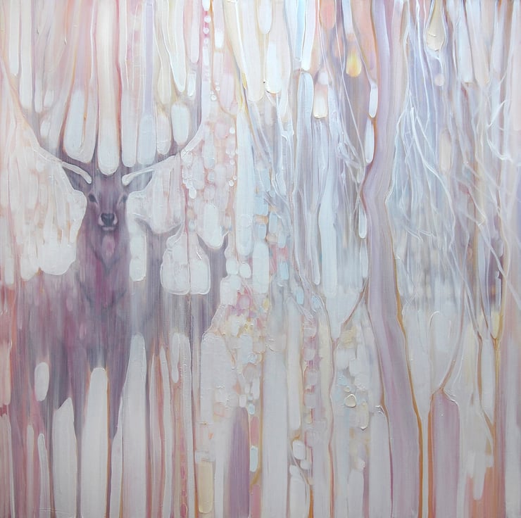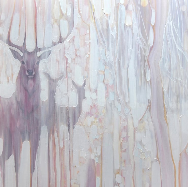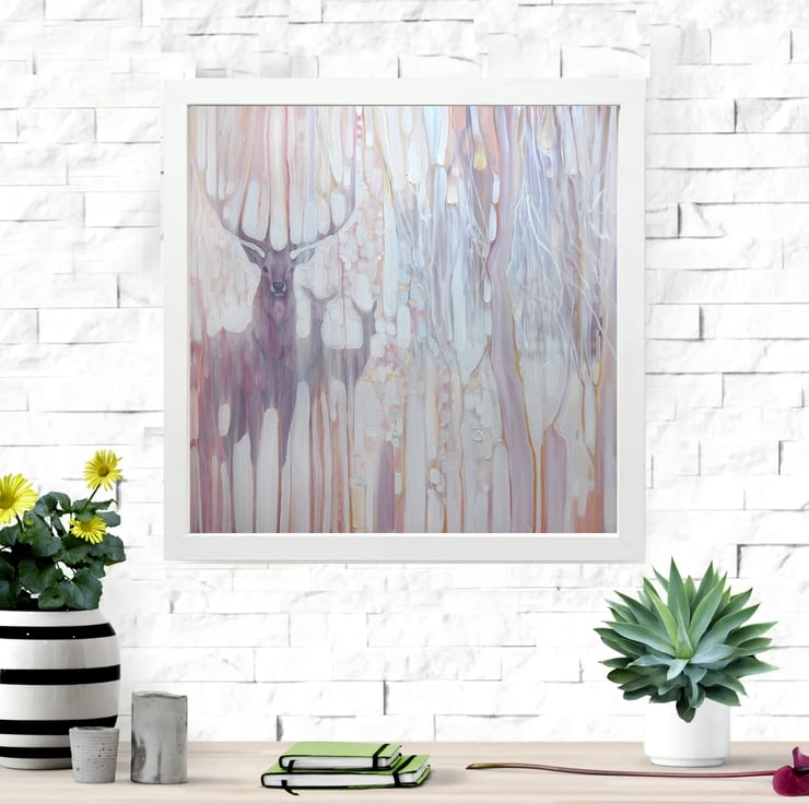 Spirit Guides is a predominantly white print of a painting of a group of deer in a winter forest. The deer are looking inquiringly at us - as deer do - and there is a suggestion of frosty branches and trees and snow. The style is a little art nouveau and slightly abstract and expressionist. The colours are pale with lots of white. The name refers to the fact that deer are often seen as being guides between this world and another. Living near the Ashdown forest as I do, I often see them and do find them beautiful and mysterious. I would be following them to other worlds if they would let me!
