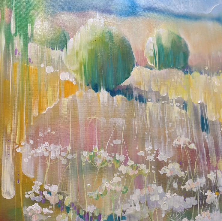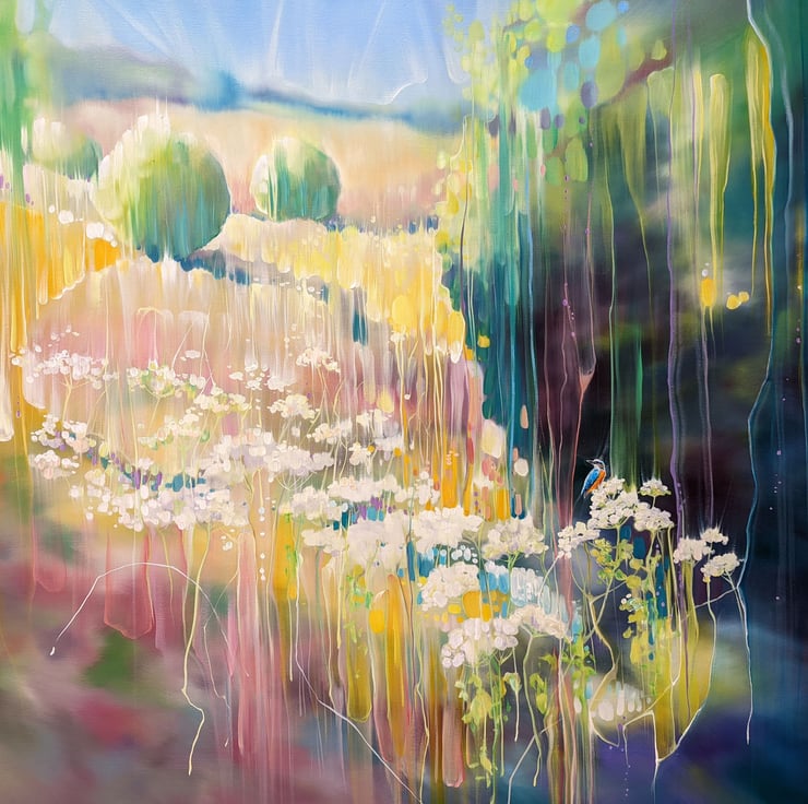The Jewel of the River is a print of an oil painting of a kingfisher by a river surrounded by fields and wildflower meadows. The edges of the painting are blurred so that you are transported into it across the white lacy cow parsley flowers in the foreground. You then see trees and fields leading off into the distance and there is a hint of a river glittering between the stalks of the flowers. The painting has transparent veils of colours moving across it that that help to give it a shimmering magical feel. To the right sitting on one of the flowers is a tiny female kingfisher. She is the jewel of the river. The painting is semi abstract contemporary art nouveau in style and was inspired by an area of the river Medway near Tunbridge Wells where I saw my first kingfisher. I love to walk and I love to spot wildlife and I find birds completely captivating. Especially highly colourful ones. This landscape encapsulates for me a perfect memory of walking along a riverbank in Springtime.