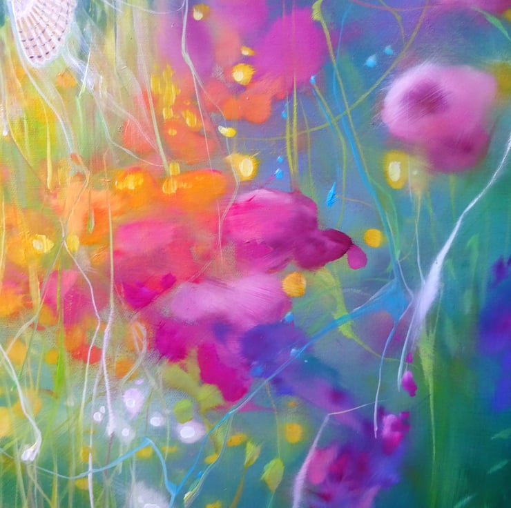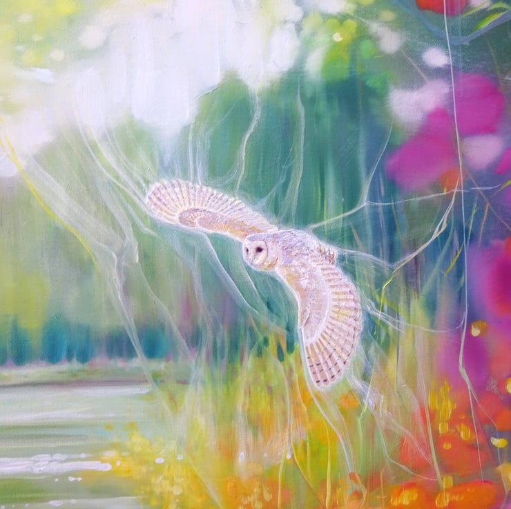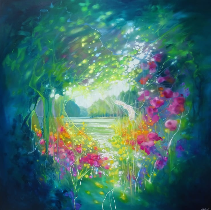 The Owls Secret Garden is a secret garden painting with wild flowers and a white barn owl flying over a sparkling green lake. It is semi abstract in style and was made by building up many layers of colour and then blurring them with a soft brush to make the paint thick and vibrant and quite intense. It was inspired by a walk I took around some fishing lakes near the Edenbridge area during 2020 lockdown. It was a place normally quite busy but was instead deserted except for birds and animals who had taken over. The green lakes and ponds had wild flowers growing at the edges and these included some sweet peas and wild roses which the flowers are loosely based on. There were shafts of sunlight coming through the woodland and trees around the lakes making the water sparkle. It looked and felt like a secret garden and that feeling is what I tried to capture. The owl was not there but I felt she should have been so I painted her anyway.