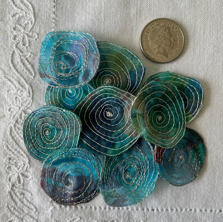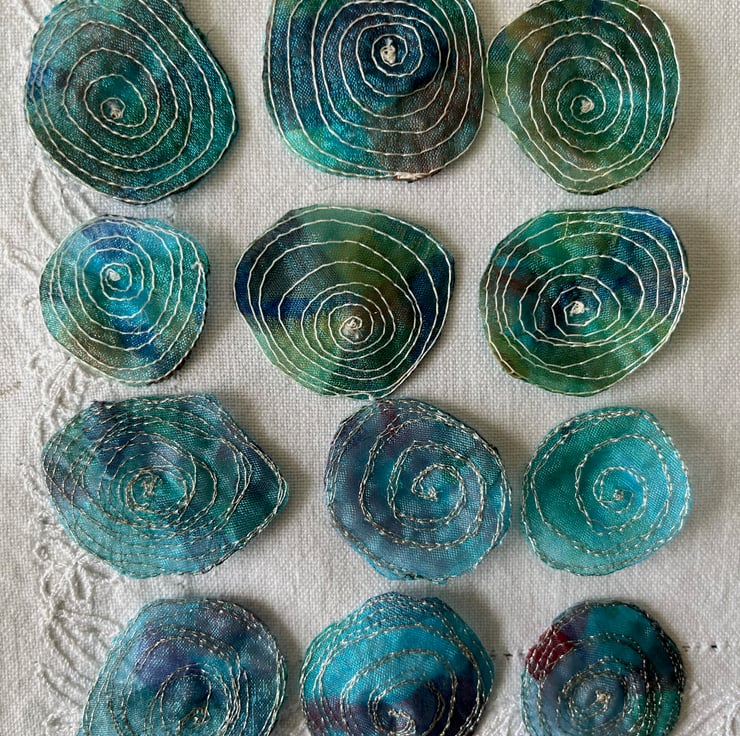 This mixed pack of 12 embellishments have been made by using free motion embroidery techniques - drawing with the sewing machine. Each one is slightly different from another, giving them a quirky and organic look. 6 are embroidered in white cotton and six in silver metallic thread.