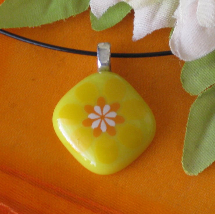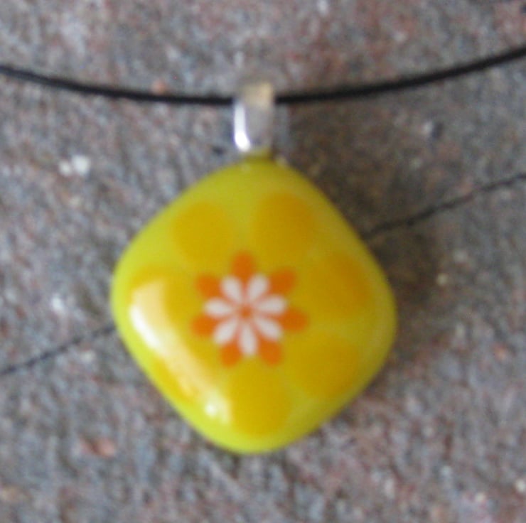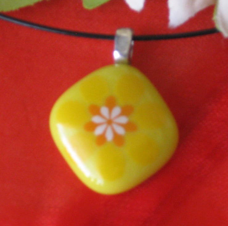 A fused glass pendant necklace with flower design.