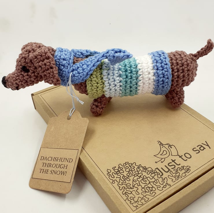 The sausage dog measures approximately 17 cm from nose to tail and comes wrapped in tissue in a labelled PIP (Postage in Proportion) box all ready to be given or posted on.