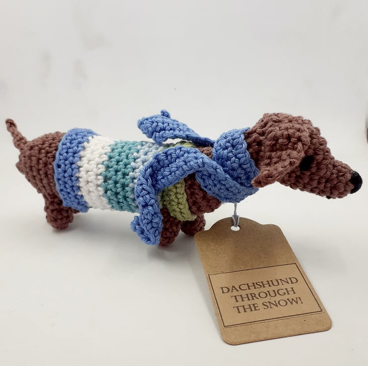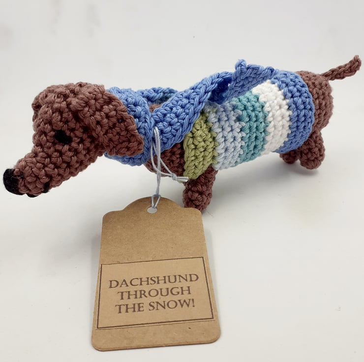 This cheerful little dachshund in a stripy winter jacket and scarf is all rushing through the snow to deliver a message on your behalf. It is crocheted in cotton from a lovely pattern by Amy at amyscrochetcave.com.