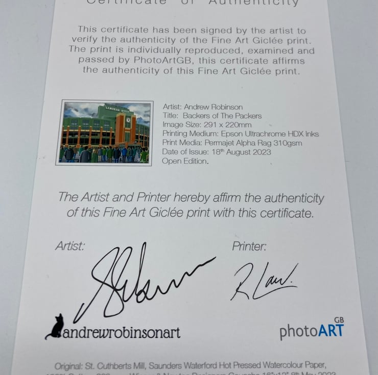 Titled ‘Backers of The Packers' this is a unique Green Bay Packers framed print direct from myself the artist. My artworks are a celebration of the match day experience and of stadium architecture.