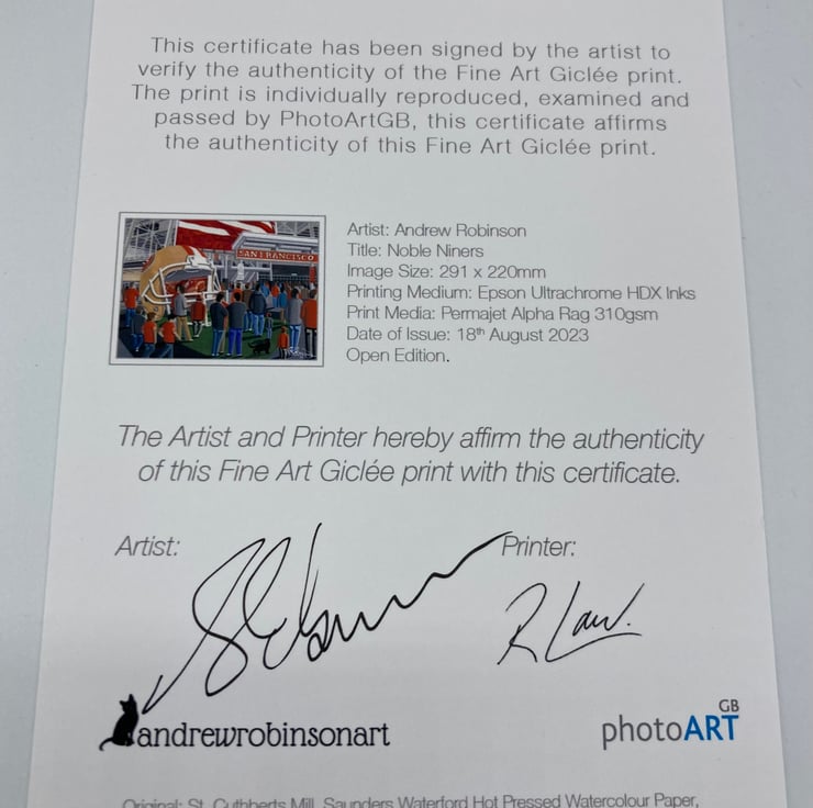 Titled ‘Noble Niners' this is a unique San Francisco 49ers framed print direct from myself the artist. My artworks are a celebration of the match day experience and of stadium architecture.