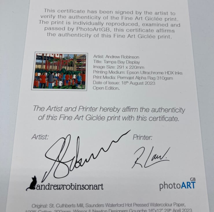 The framed print comes with a 'Certificate of Authenticity' which documents the details of the original painting and the art print. The Certificate of Authenticity is affirmed with a signature from both myself (the artist) and the printer.