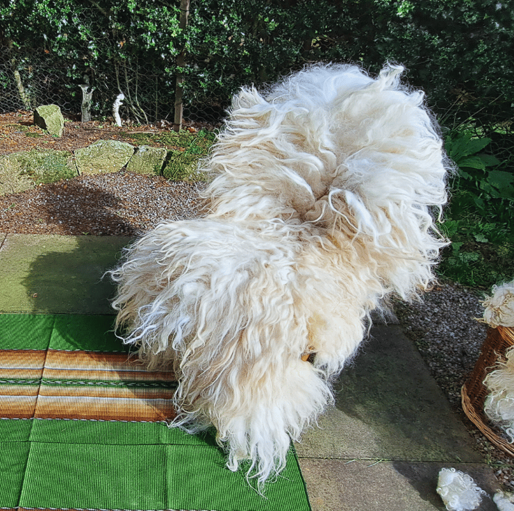 Use a small amount of wool detergent and soak it in a warm water bath – then let it drip dry. Stretch the rug out firmly when it is still damp. Let the fleece dry naturally in the sun – this may take a few days. Never brush a curly fleece just work your fingers gently through the locks. However, if it does not have curls you can give it a light brush with any ordinary hairbrush.