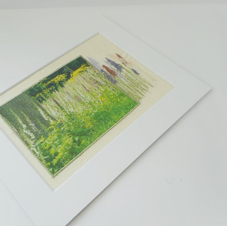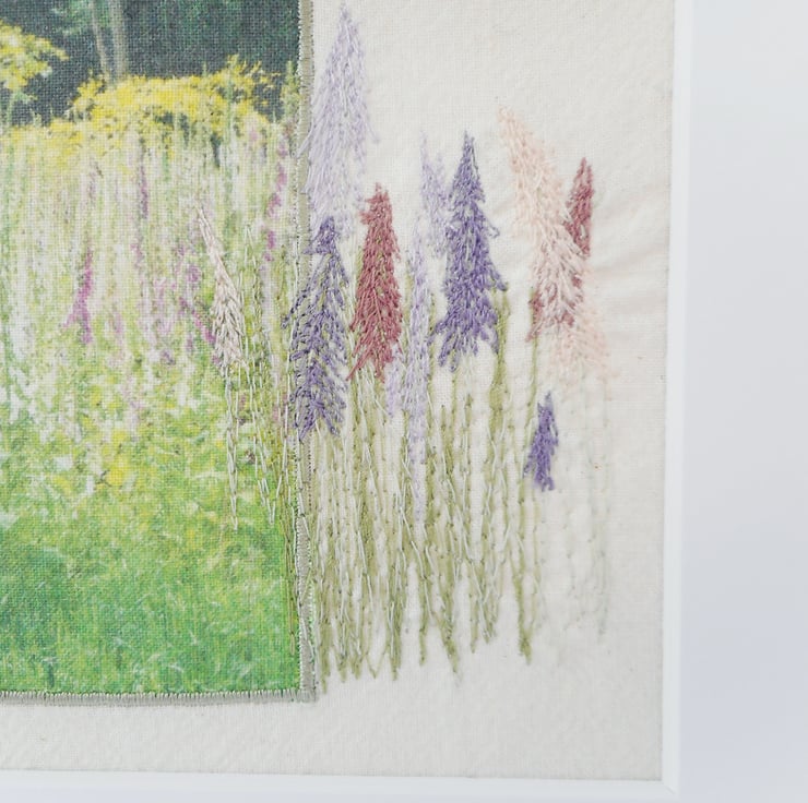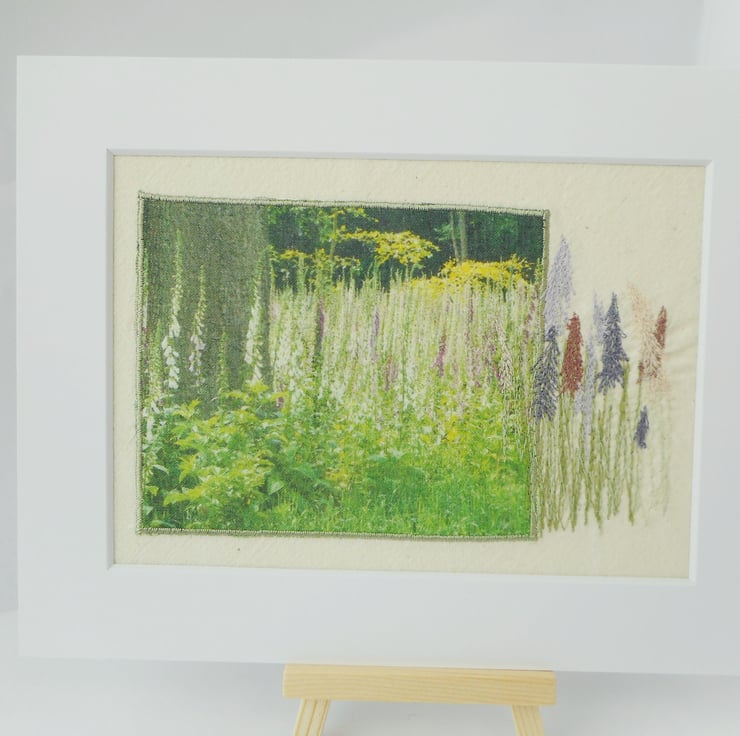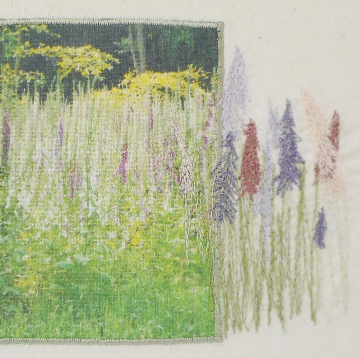 The main image is a photograph I took on a visit to a woodland, printed onto fabric and them embellished with simple free machine embroidered foxgloves.