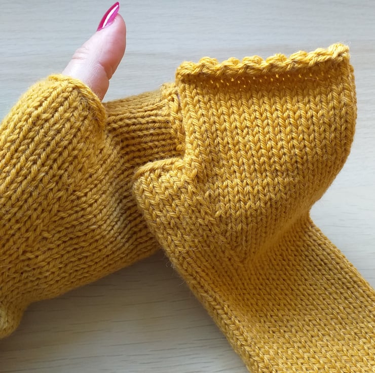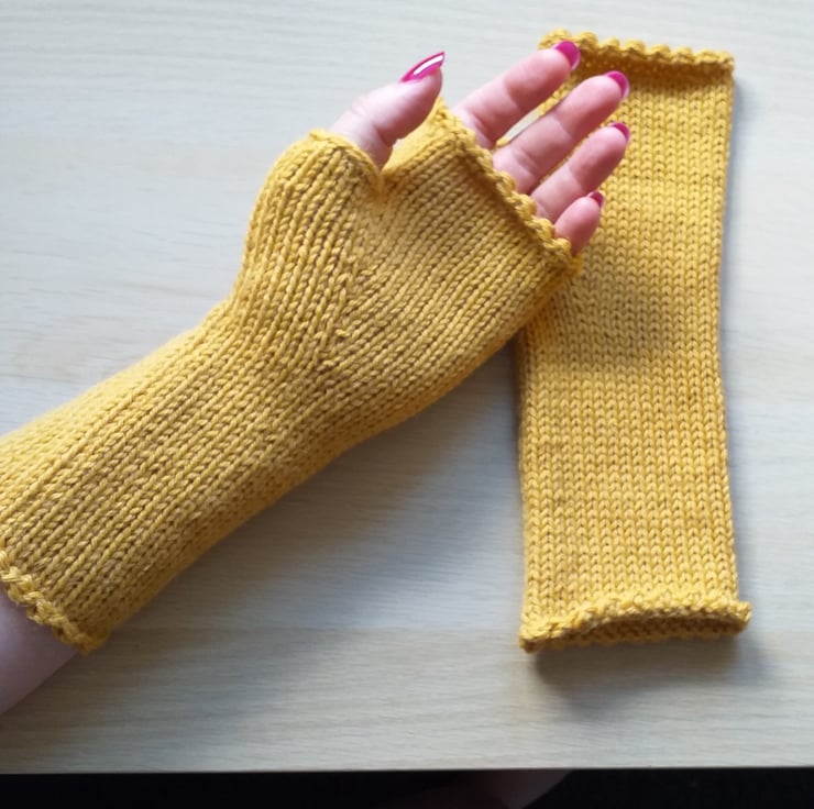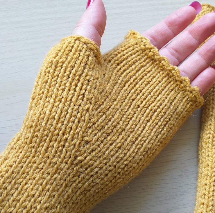 Knitted in Stocking Stitch with shaping around the hand and thumb opening. At each end of the glove’s is a row of ‘Picot’ crochet edging to finish them off with style.