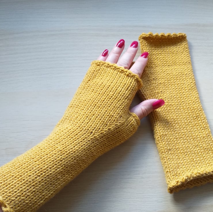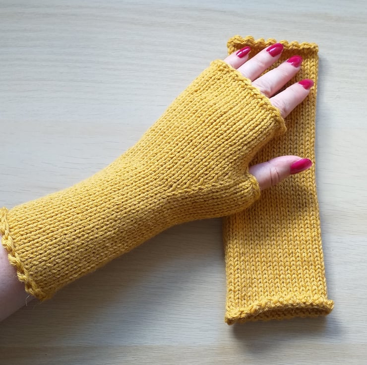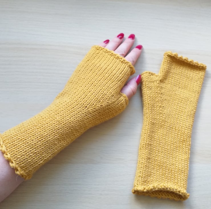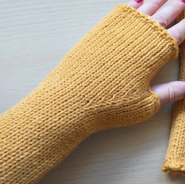 A pair of minimalist knitted fingerless gloves in a shade of Harvest Gold