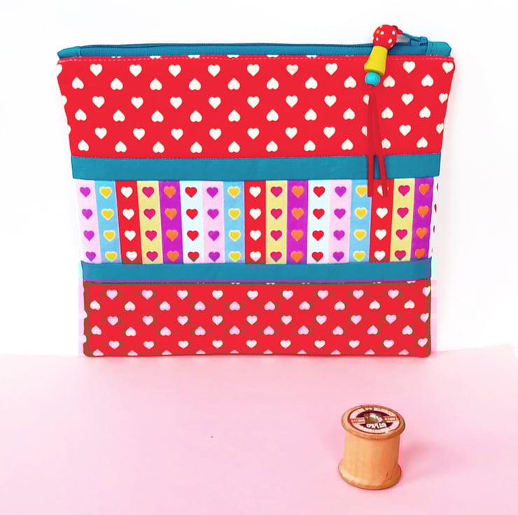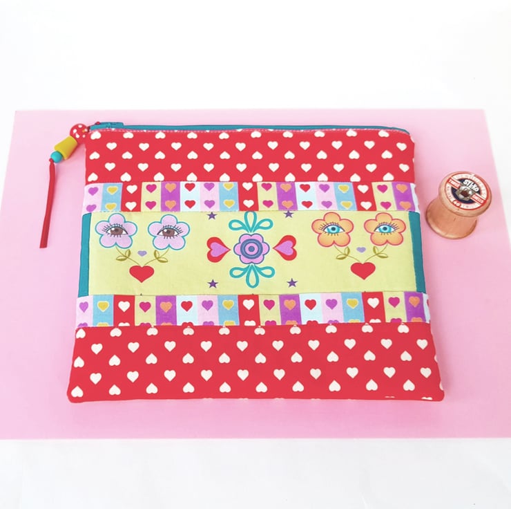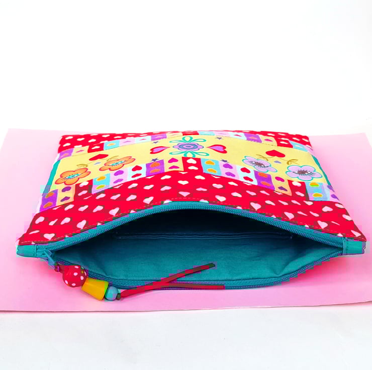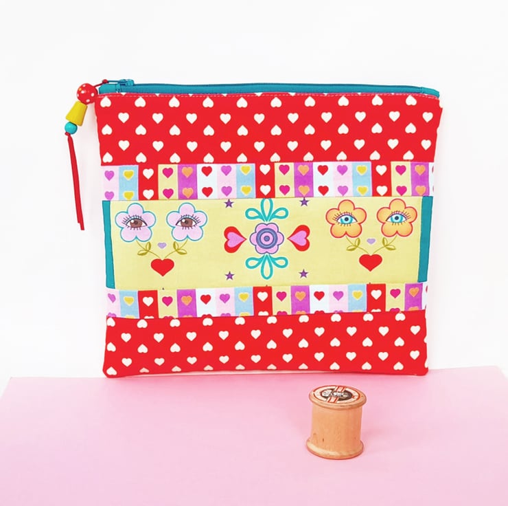 This cute quilted patchwork zipper pouch has been handmade using 100% cotton fabrics from our The Eyes Have It collection and plain teal 100% cotton fabric.
