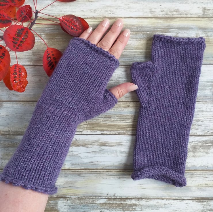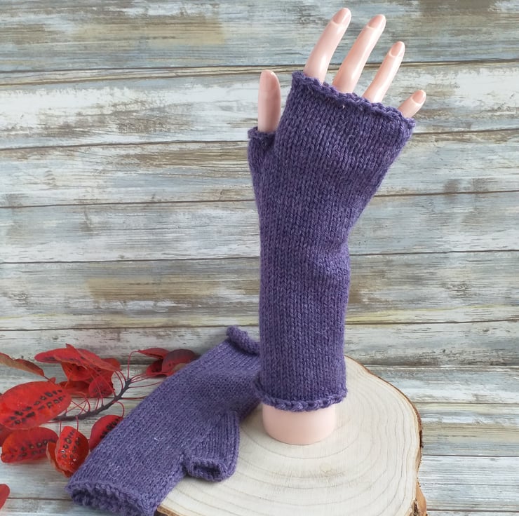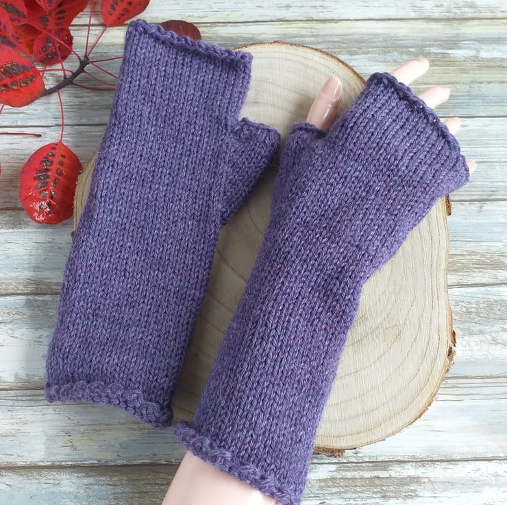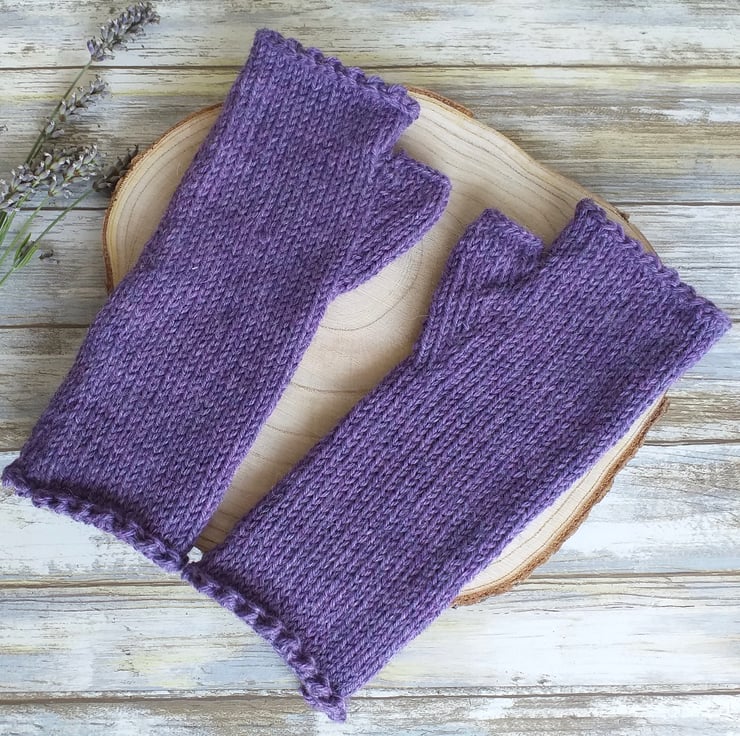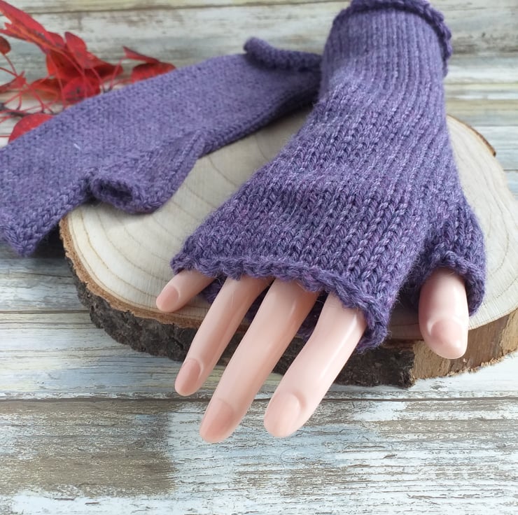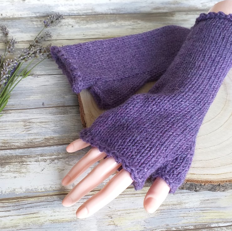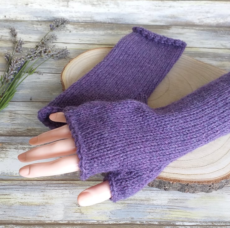 A pair of minimalist knitted fingerless gloves in the shades of Purple Heather, and running through this lovely yarn are subtle shades and tones of purple and lavender, with the soft Alpaca fibres giving the knitted yarn a blended, natural look.