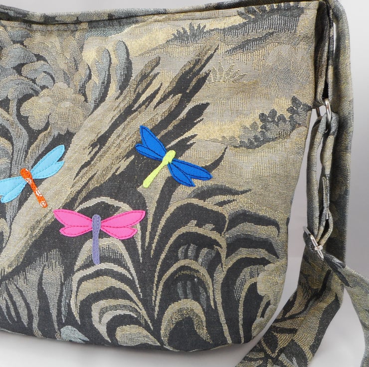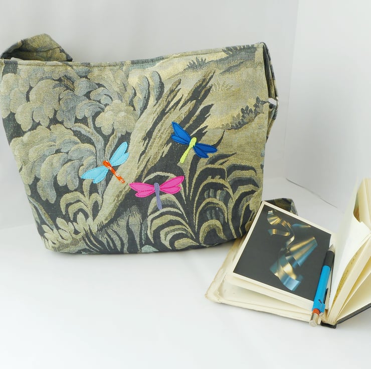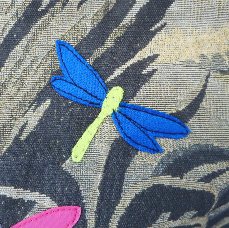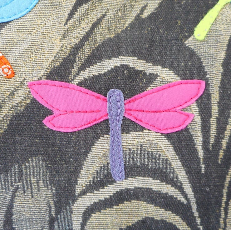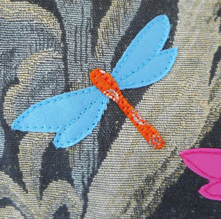 The front has been embellished with applique dragonflies in vibrant colours to contrast with the rather dark jacquard fabric.