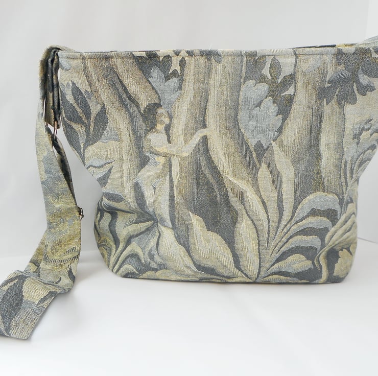Fabric shoulder bag with adjustable cross body strap. This is a soft, unstructured bag.
