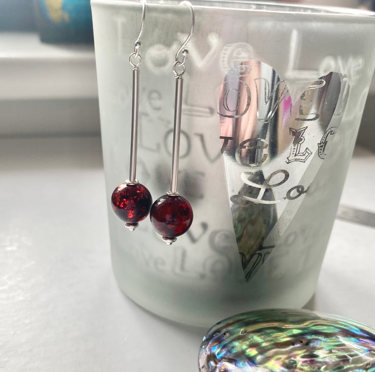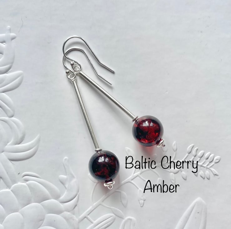 Beautiful handmade long drop Amber earrings featuring 10mm cherry Amber rounds and 925 sterling silver tubes. I have finished the earrings with sterling silver shepherd hooks. Gorgeous earrings that have lots of movement and are so light to wear.