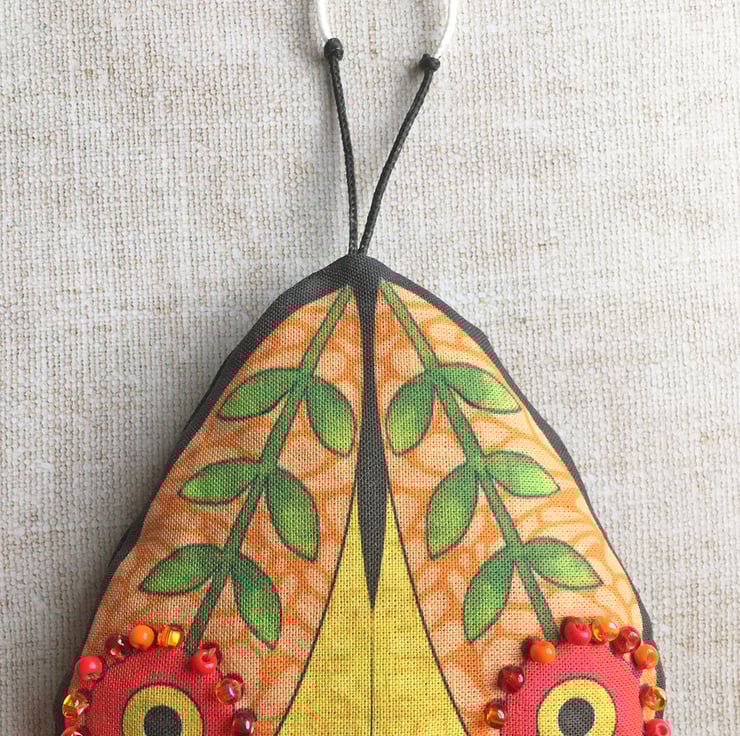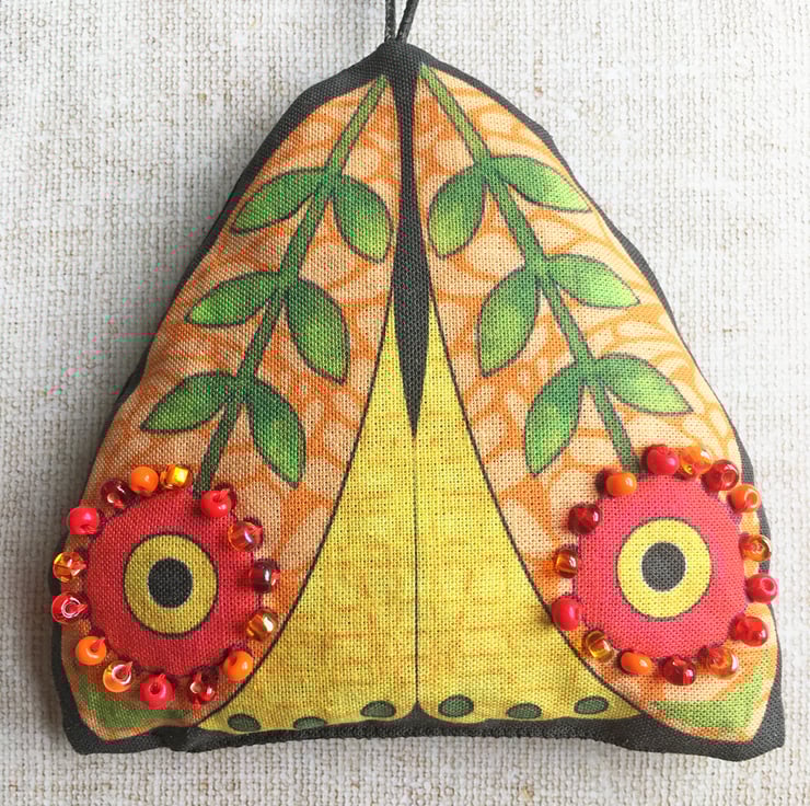 The lavender bag is my own design which I've had printed onto cotton fabric. I've embellished it with seed beads and incorporated the antennae into the hanging loop. The back of the bag is plain black.