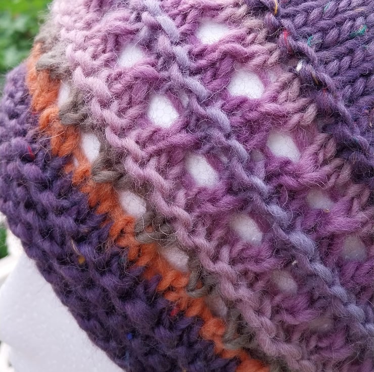 This hat incorporates an eyelet pattern design and the hat is a plain colour with muted rainbow colourwave as a decorative band.
