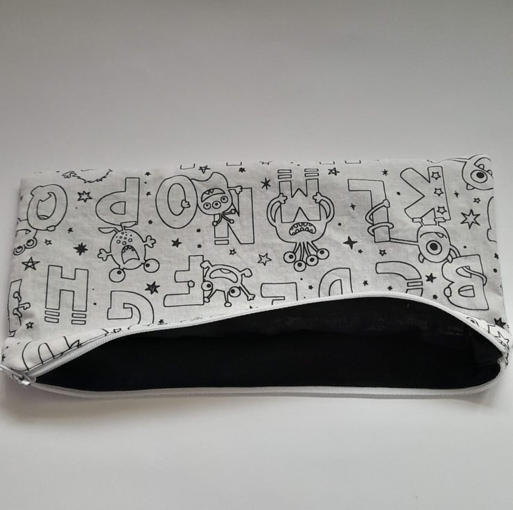 This is a pencil case that you can colour in yourself to make it an individual design. The pencil case measures approximately 25cm/ 10inches in length and is approximately 13cm/ 5.25inches deep. The pencil case has been lined with a black cotton fabric.