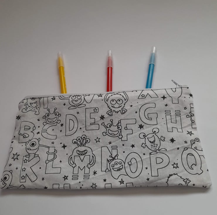 Colour in the pencil case with fabric pens for a permanent design or use washable pens so that you can colour it again and again...