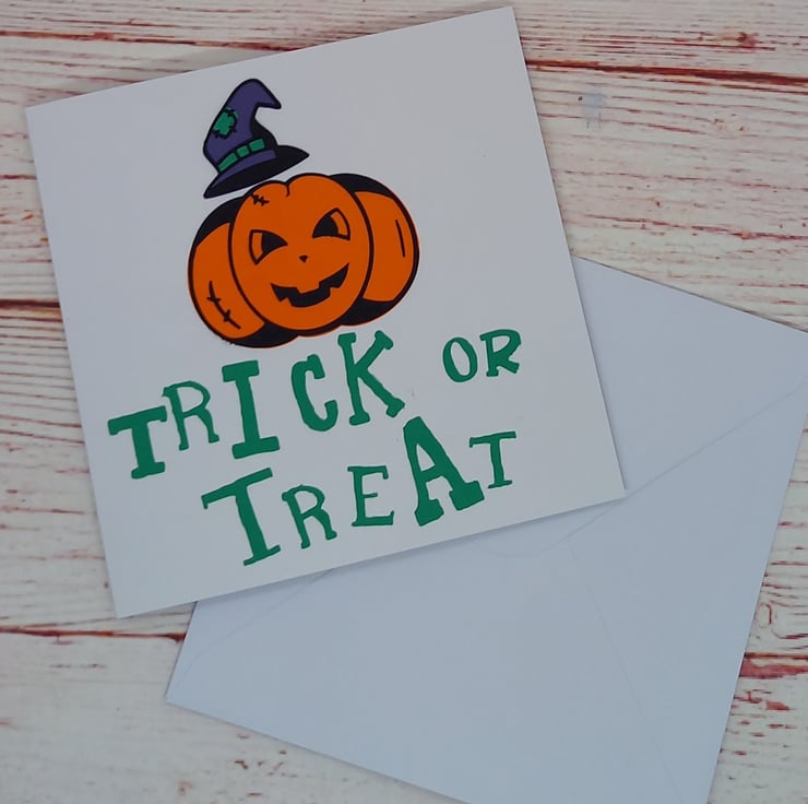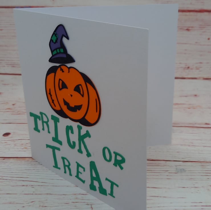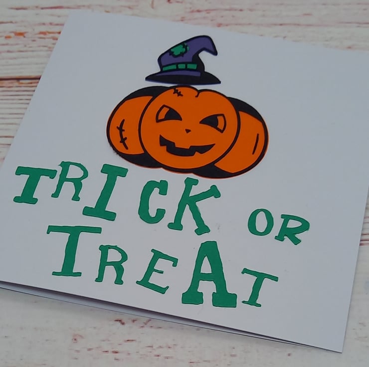 Featuring a cartoon pumpkin wearing a witches hat and the phrase 'Trick or Treat' this card is simple yet effective...