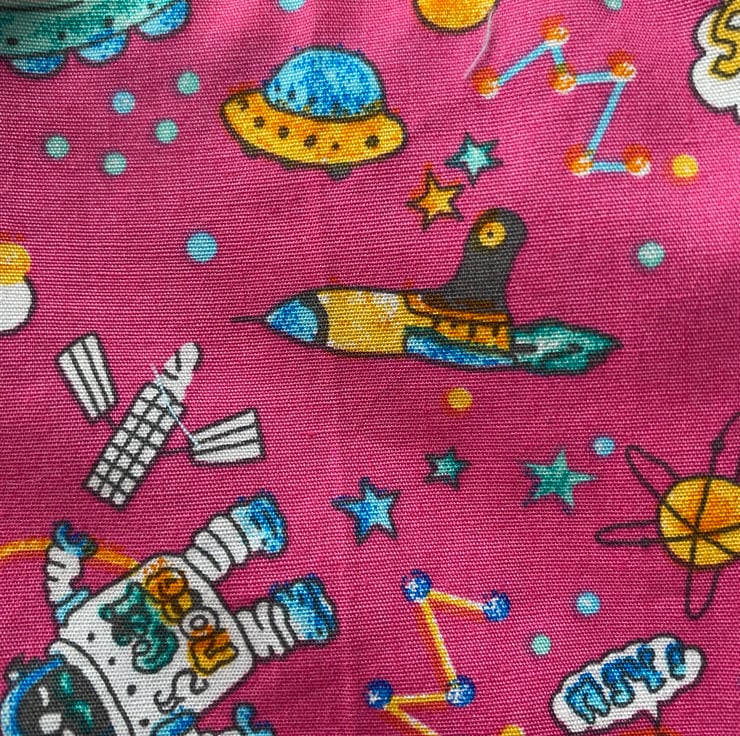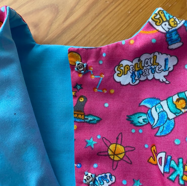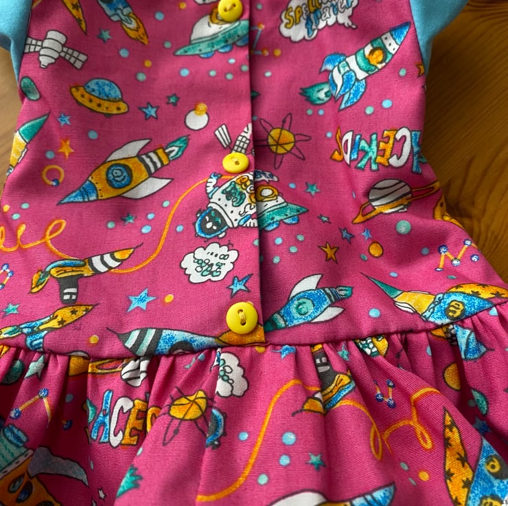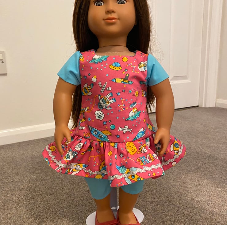 This dolls tunic dress is in a pink space themed fabric, coordinated with turquoise and cropped style turquoise trousers. The dress is edged in silver. The dress is lined.