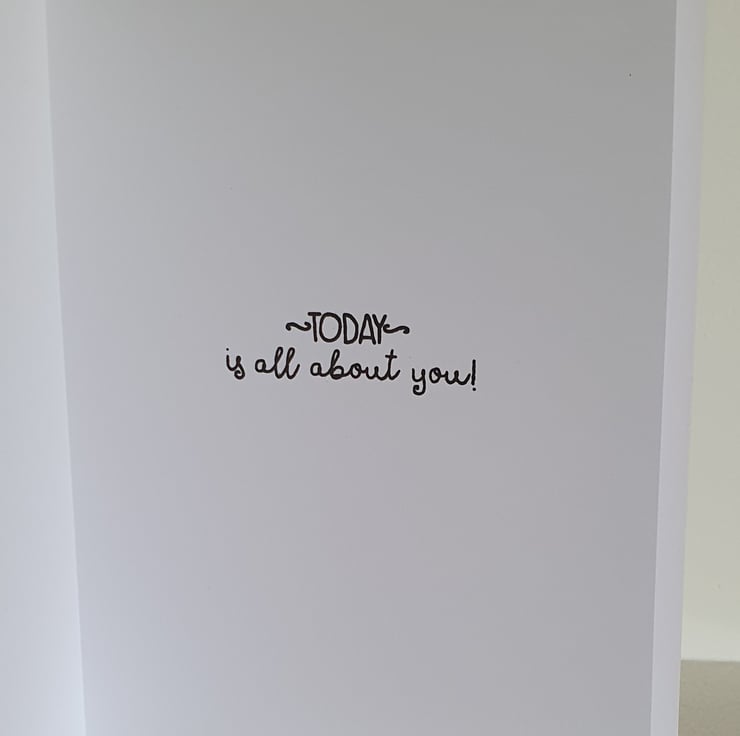 All stamped and coloured on to a quality 300gsm base card. Inside a sentiment stamped on to 120gsm, smooth paper- ' Today is all about you'.