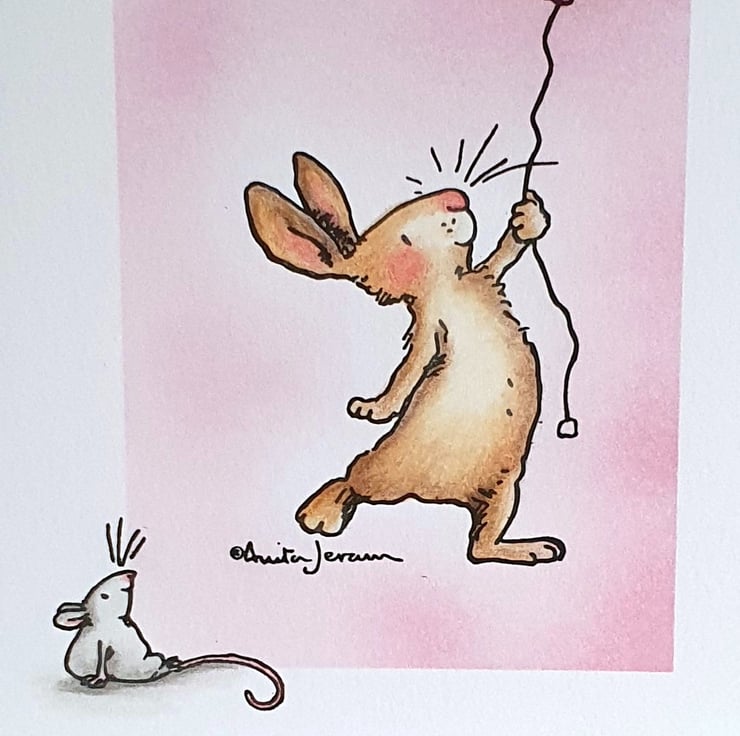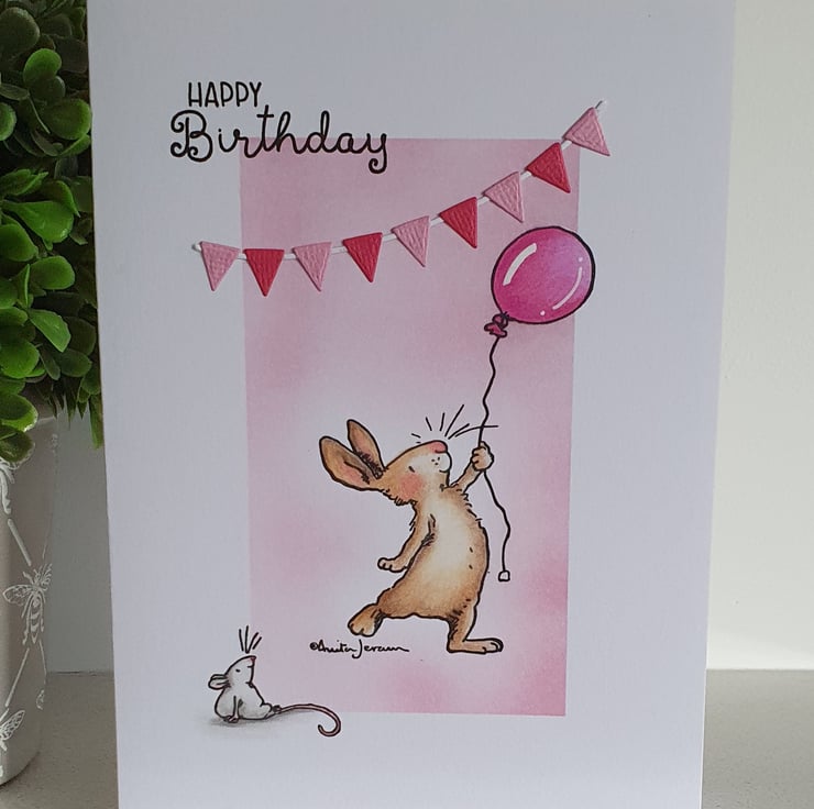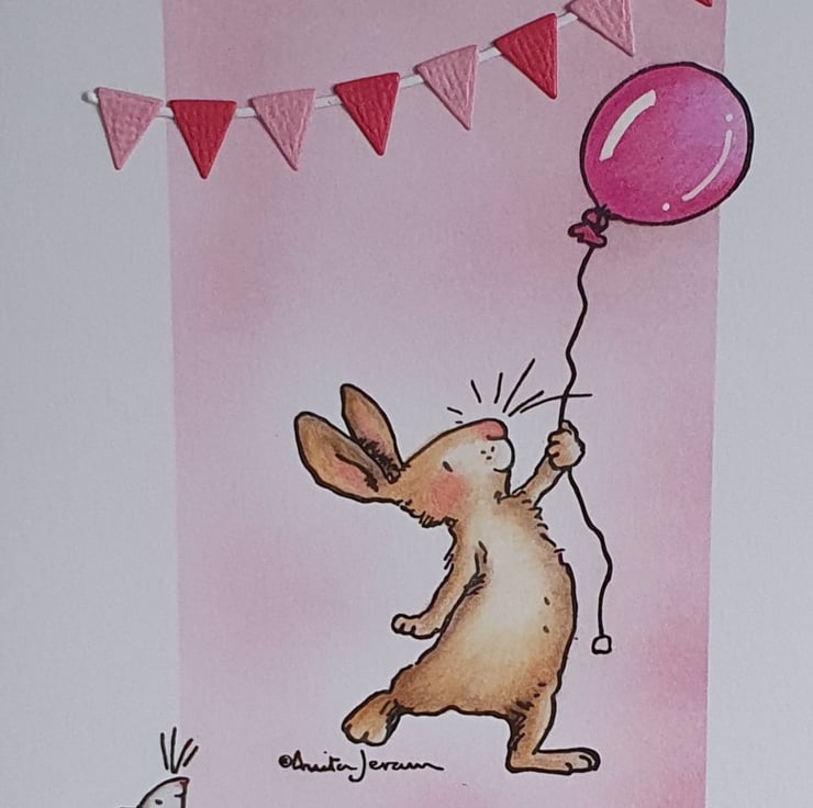 A really, cute, pretty card for a little girl- featuring an adorable rabbit with her beautiful pink balloon..