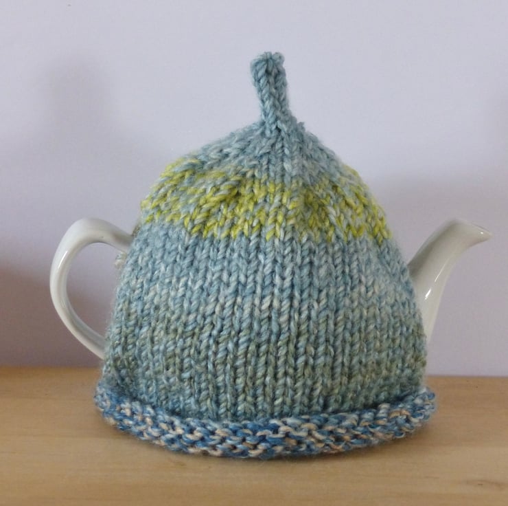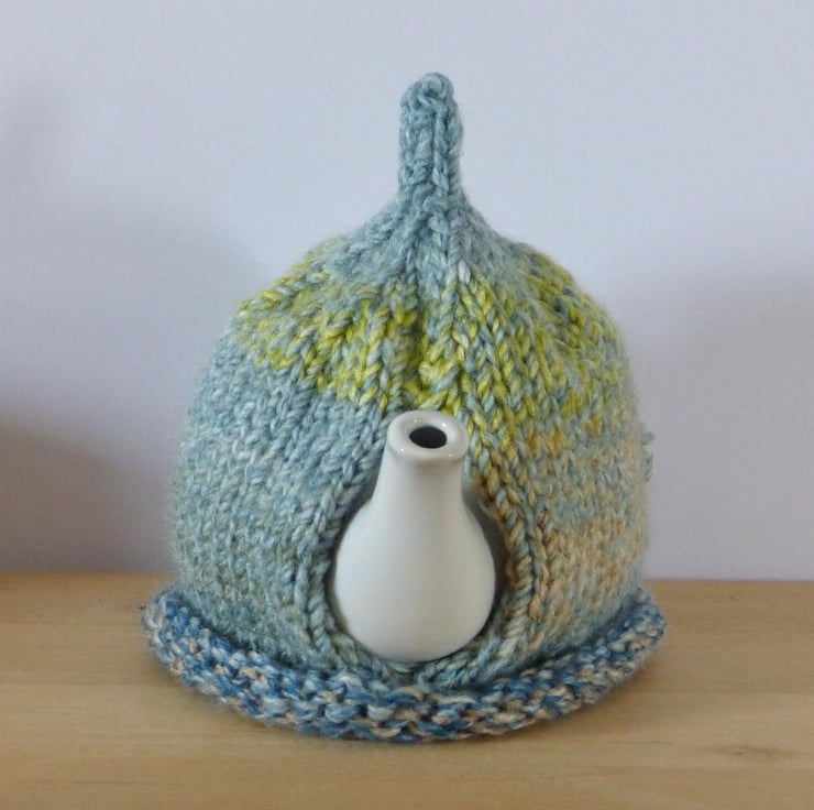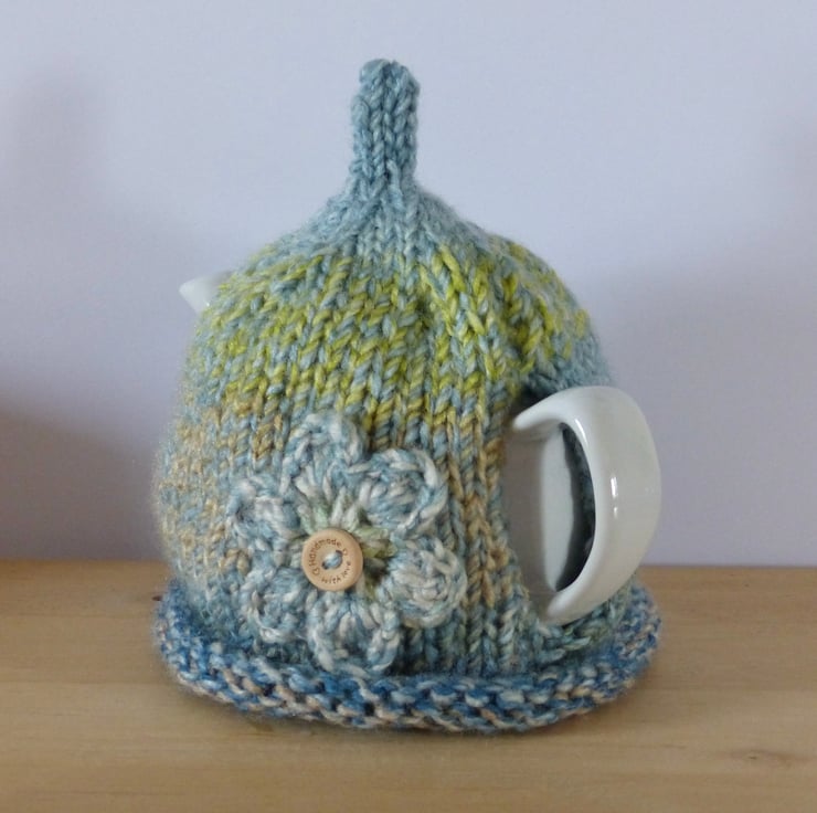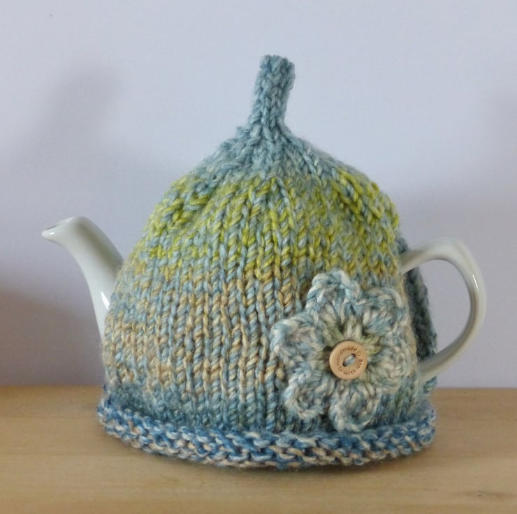 A hand knitted Tea Cosy in a chunky variegated yarn in shades of Blue, Green and Beige. It has a 'pixie' top and a crocheted flower (in the same yarn as the cosy) on the front with a natural wood button with the words 'Handmade With Love' in the centre. Knitted to fit a standard Two Cup pot this cosy has a roll rim and plenty of stretch so should fit a variety of small pots. An ideal gift for a Tea Lover or as a New Home or House Warming Gift.