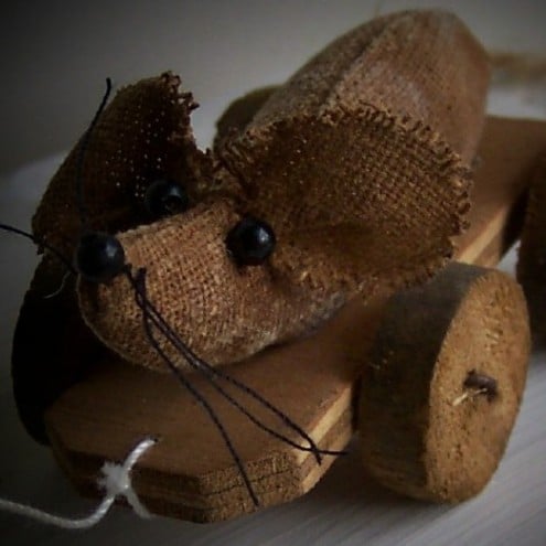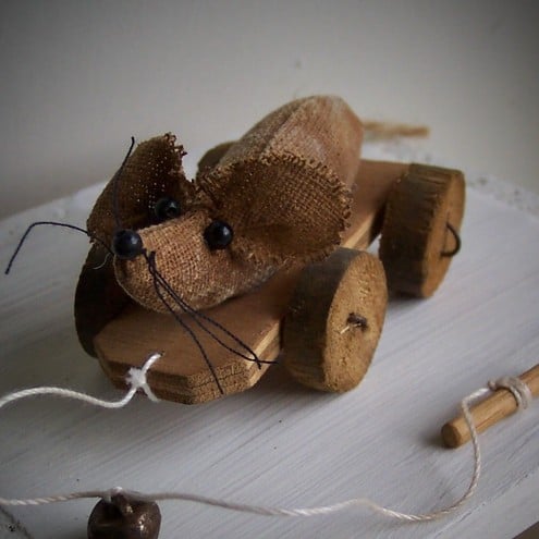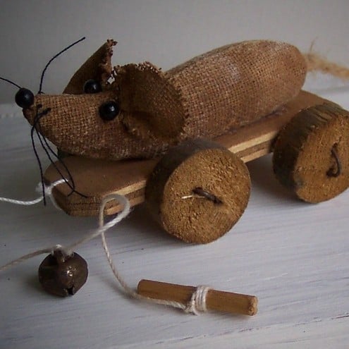Tiny, primitive, mouse pull toy measuring 7.50cms.(excluding tail and pull string). Mousie is made from coffee dyed Osnaburg fabric and sanded back so that she has a vintage look.The board on which she sits is ply, the wheels are made from an old broom handle and are attached with rusty wire.She has little glass bead eyes (and nose) and cotton whiskers.There is a little rusty bell on her pull string.