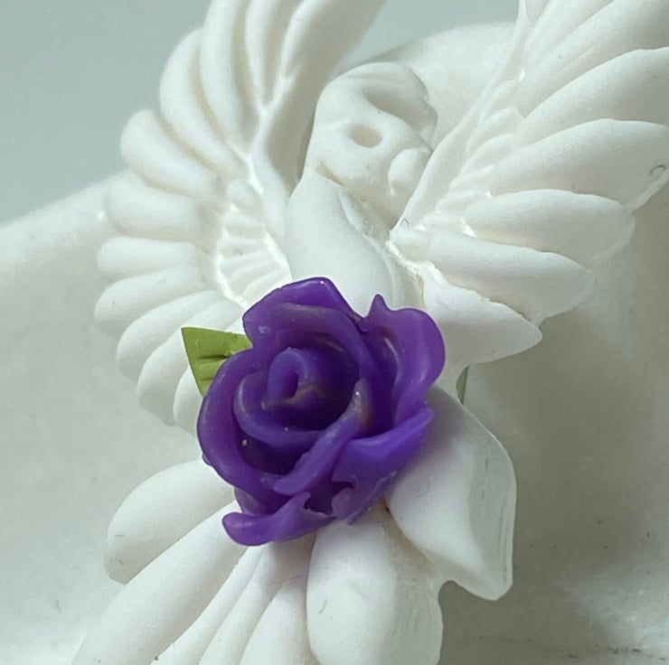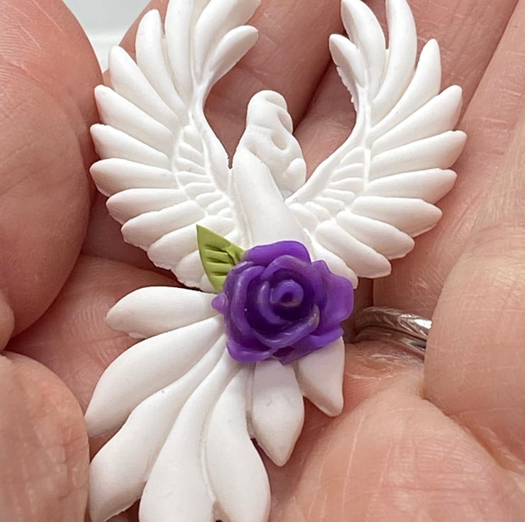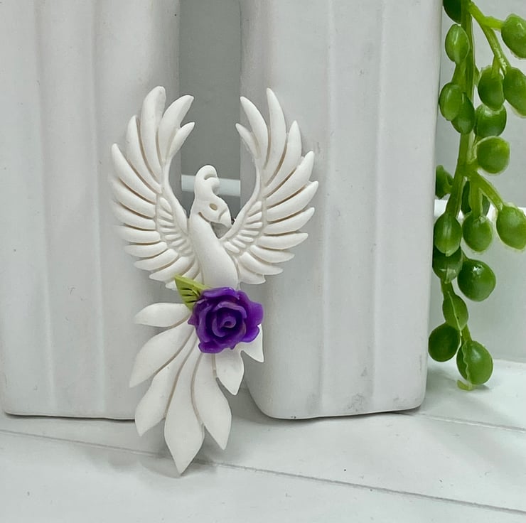 The purple rose compliments the pure white bird with stark contrast making it really stand out, and bringing out the elegant detail of the phoenix's wings and tail.