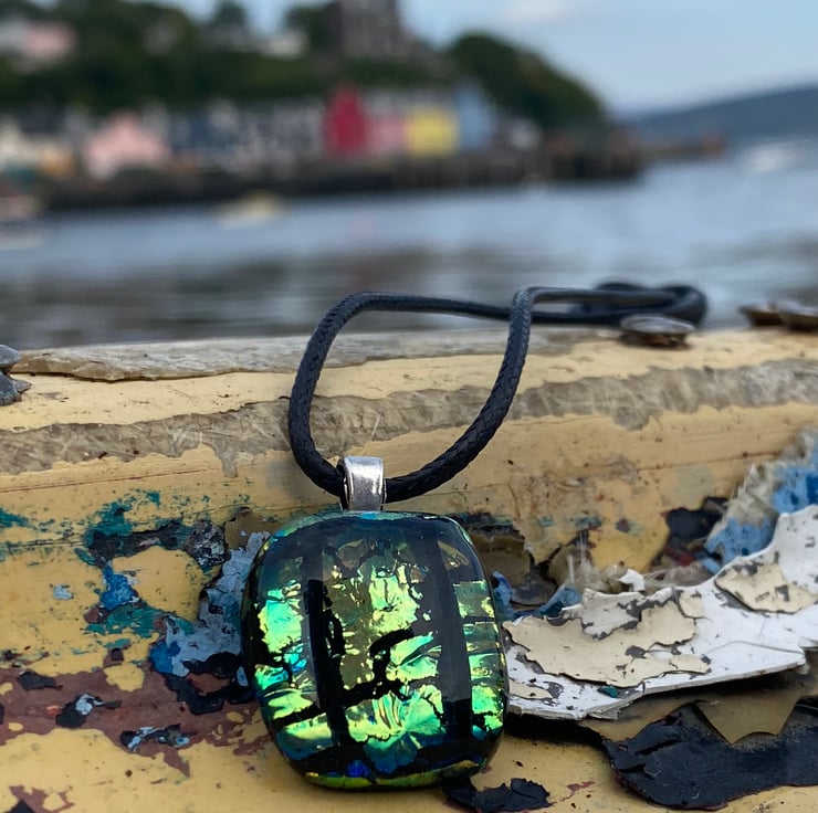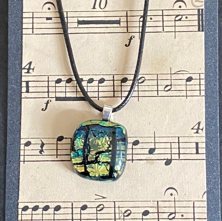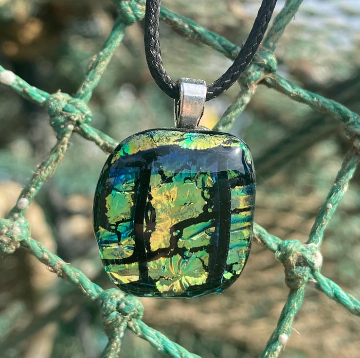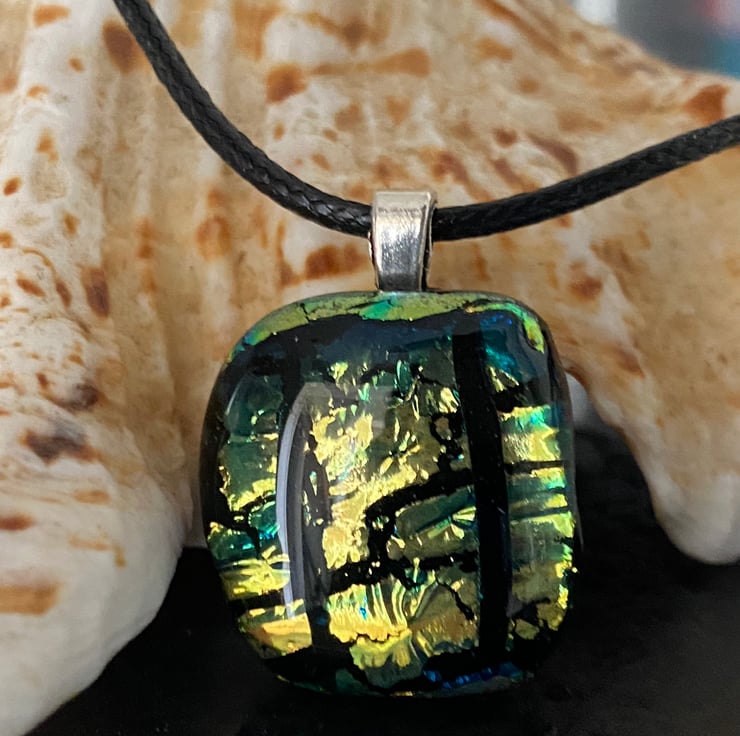 This stunning glass pendant with the gold iridescent detail is eye catching. Measuring less than an inch this is beautiful day to night piece.