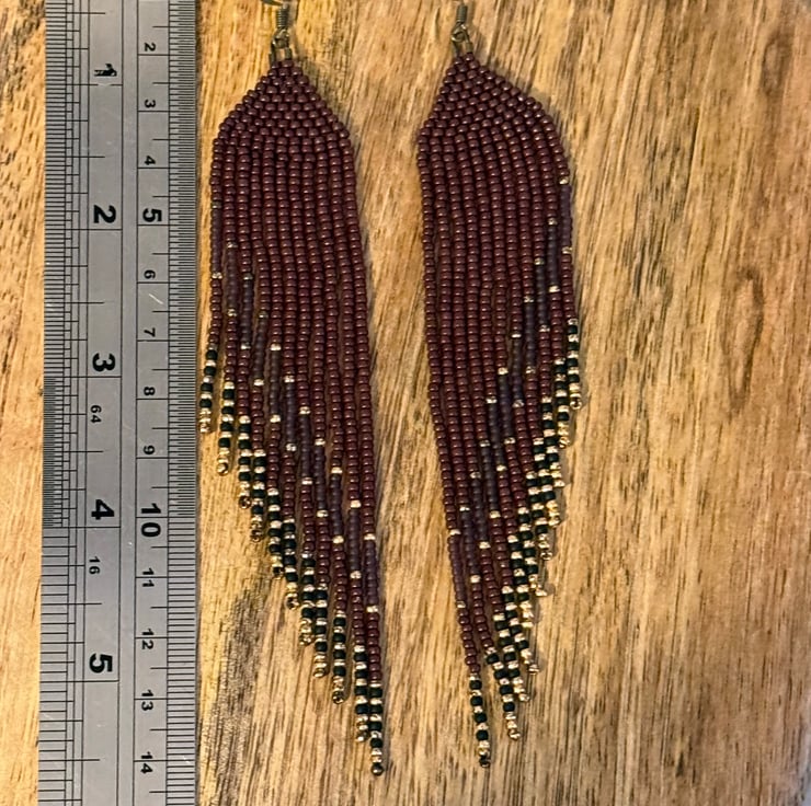 The fringe has an ascending shape and the full length of these earrings including the bronze tone ear wires is 15.5 cm.