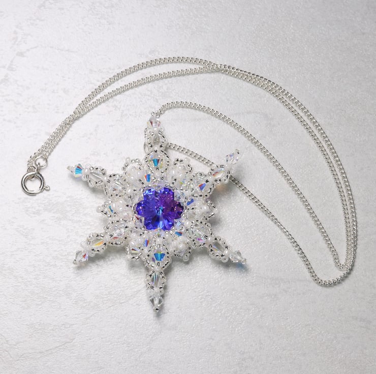 It is made from silver-lined Japanese Toho seed beads, Swarovski crystals with an AB (aurora borealis) coating, spike beads and a 14mm Swarovski rivoli in heliotrope. The pendant is made by a process called beadweaving, by which the beads are sewn together by strong beading thread (not unlike fishing line.