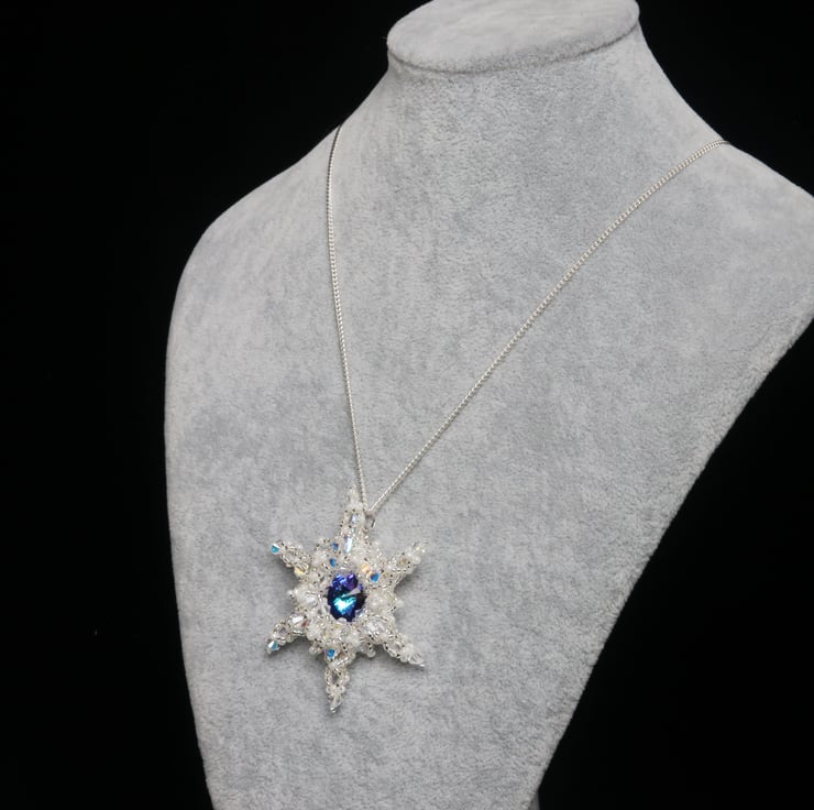 An ultra-sparkly beadwoven pendant with lots of crystals centred on a beautiful Swarovski heliotrope Rivoli. This would look stunning with a special outfit or when you just want your jewellery to make a statement. The pendant hangs from a good quality 18ins long sterling silver curb chain finished with a bolt ring clasp.
