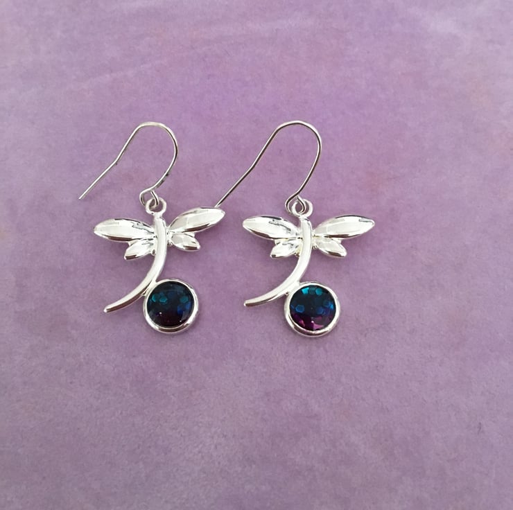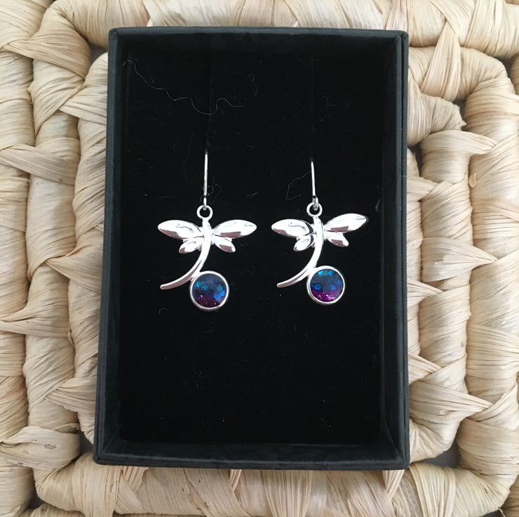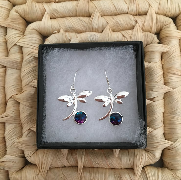 Pretty handcrafted dragonfly tri-coloured centred earrings in a quality silver plated setting.