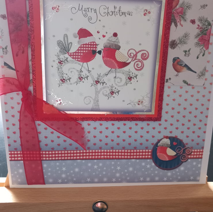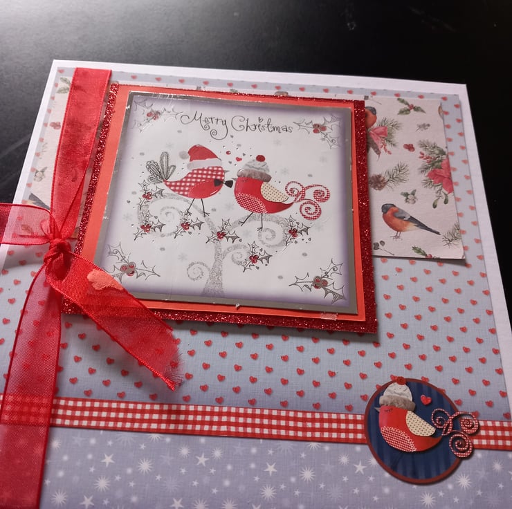 Card measures just under 8 inches square. The card is layered with patterned paper then finished with a topper with a quirky robin design which is layered on to red card and silver mirror card. Red organza ribbon completes the design. This card can be personalised. Just message me when ordering.