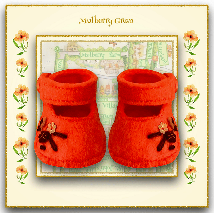 A lovely little pair of orange embroidered and sequinned shoes, to fit the Mulberry Green characters. The shoes are made from double stitched felt and fasten with poppers underneath the buttons.