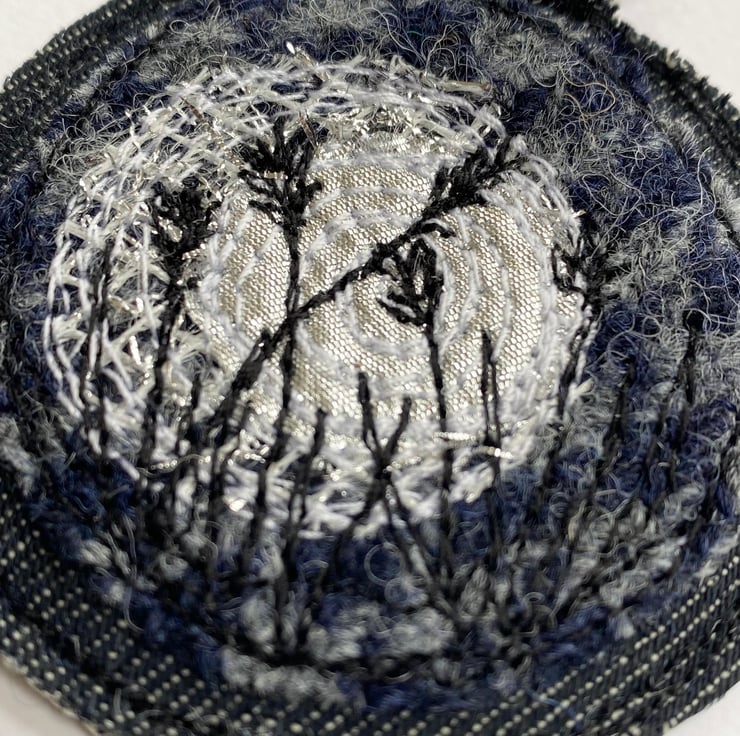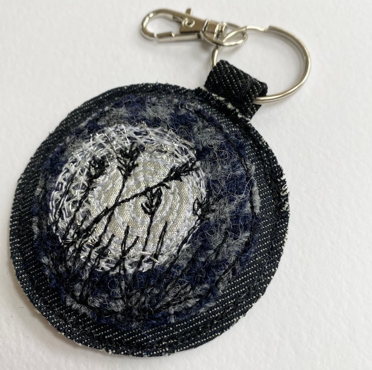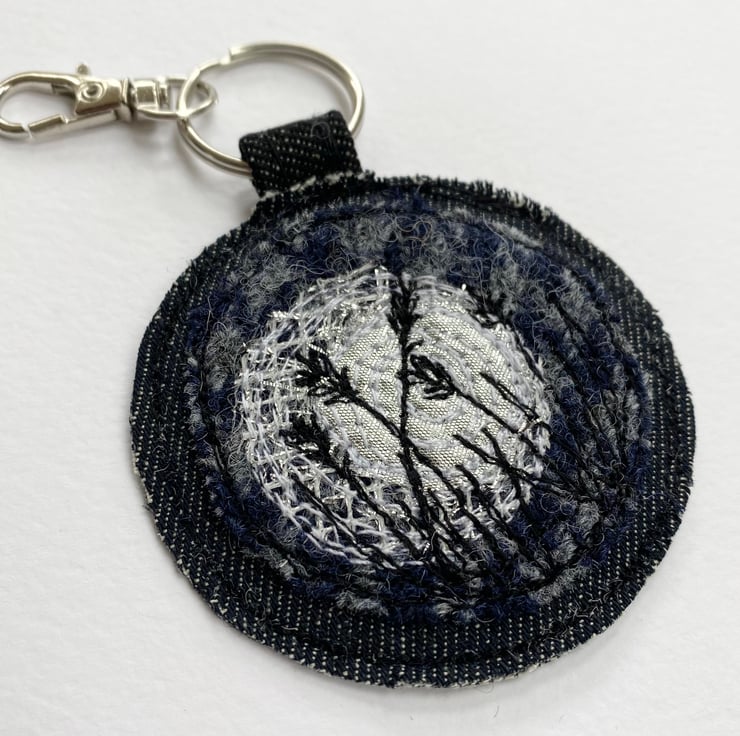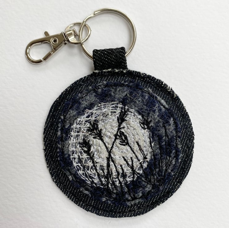 My cute up-cycled silhouette grasses keyring is made with up-cycled fabric and is framed by a full moon. It’s plain in the back. It measures 6.5 diameter. With the split ring and lobster clasp the length is 12cm.