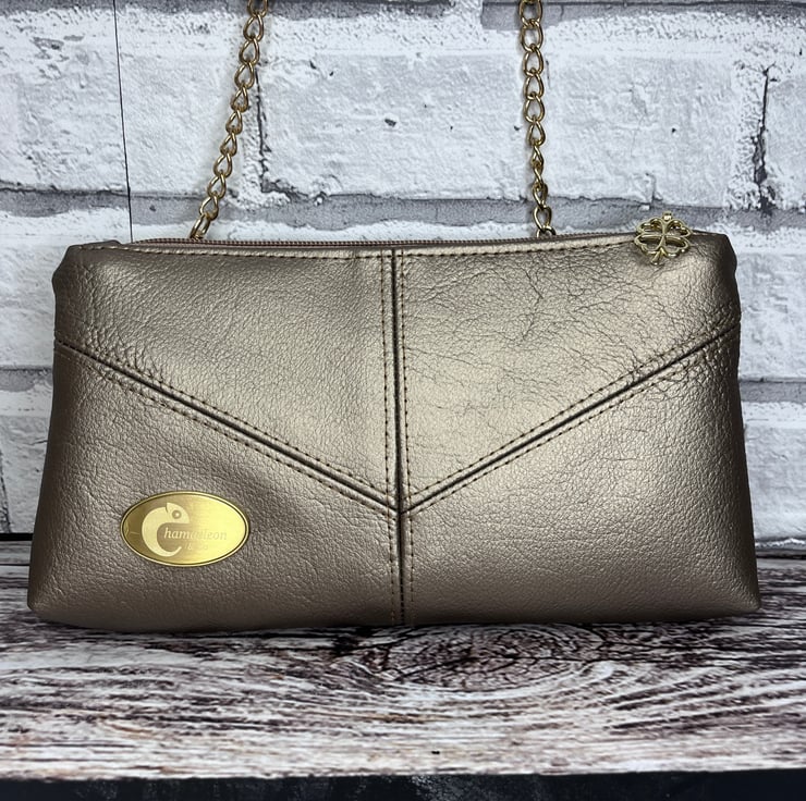Bronze Clutch bag in faux leather with removable shoulder bag gold chain