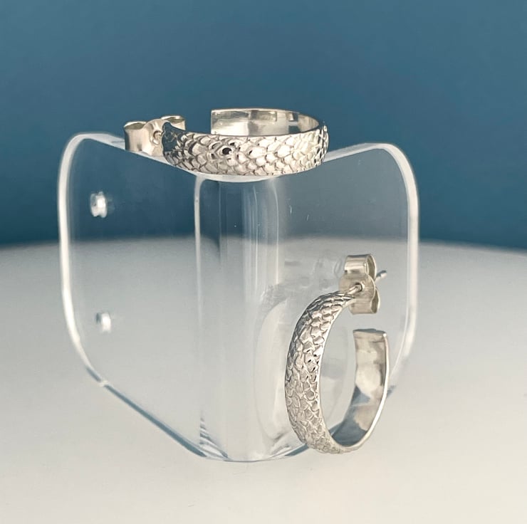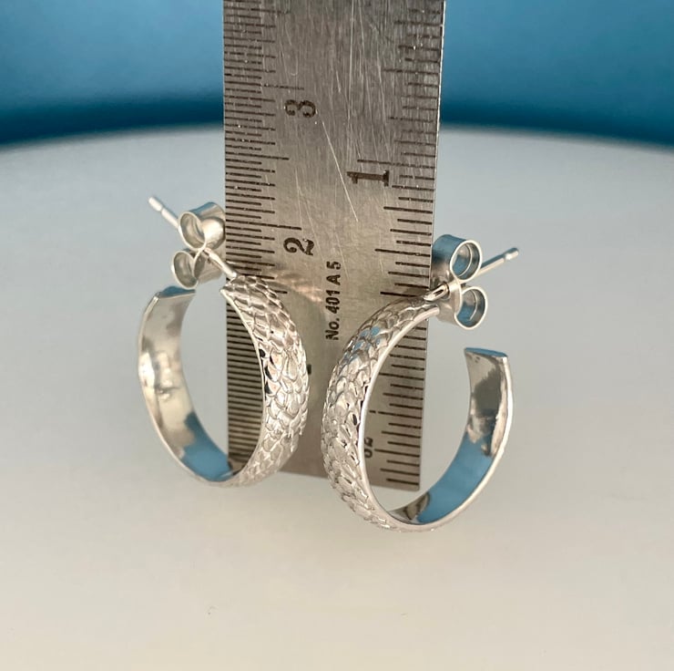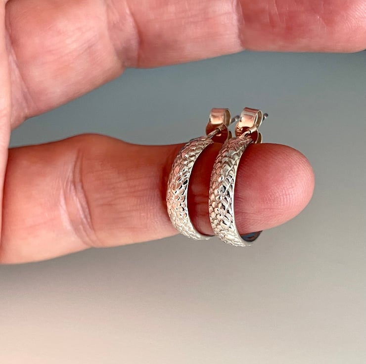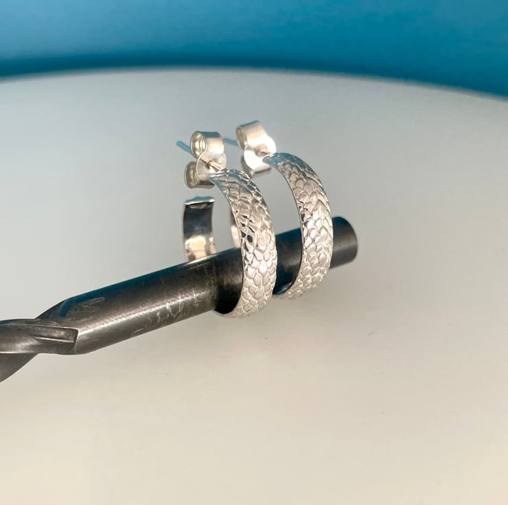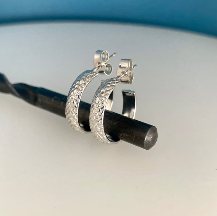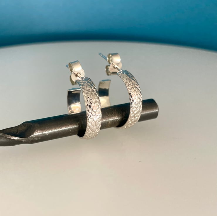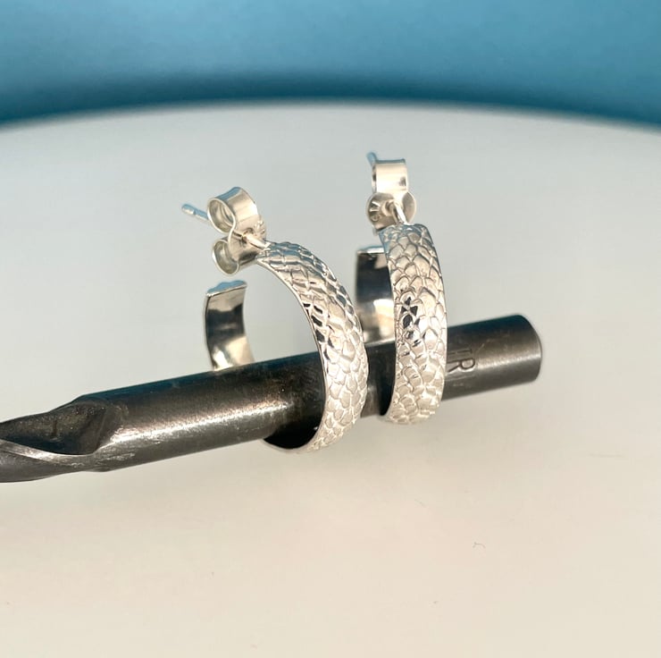A beautiful pair of small wide hoop earrings handmade from 925 sterling silver. Cut by hand from solid 1mm thick/4mm wide silver snakeskin patterned wire then formed into circular shapes. They have silver pin fittings and secured with stamped (925) silver scroll’s/butterfly’s