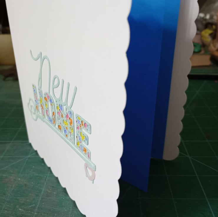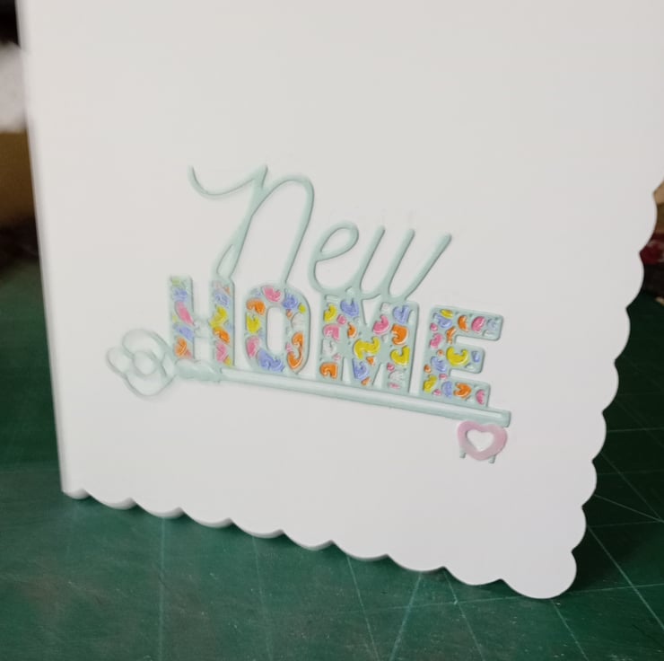 A completely handmade and uniquely designed card. Consisting of a new home with key to the door diw cut from duck egg blue card, mounted onto quality pristine white scalloped card. Hand coloured in pastel shades