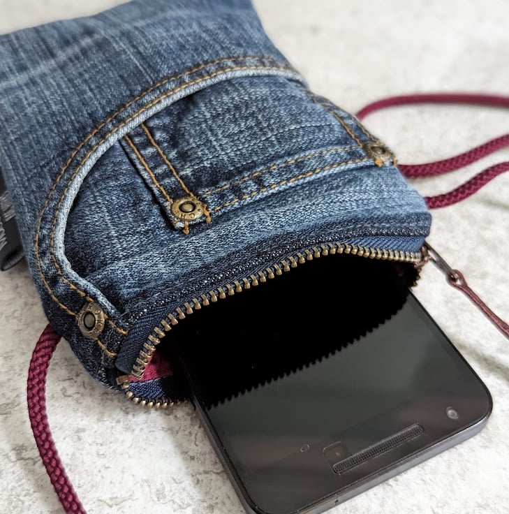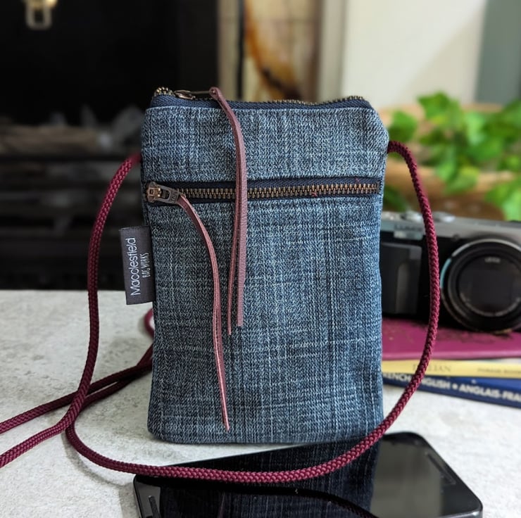 Handmade using pieces of preloved denim jeans carefully sewn together to make this recycled mini cross body phone bag.
