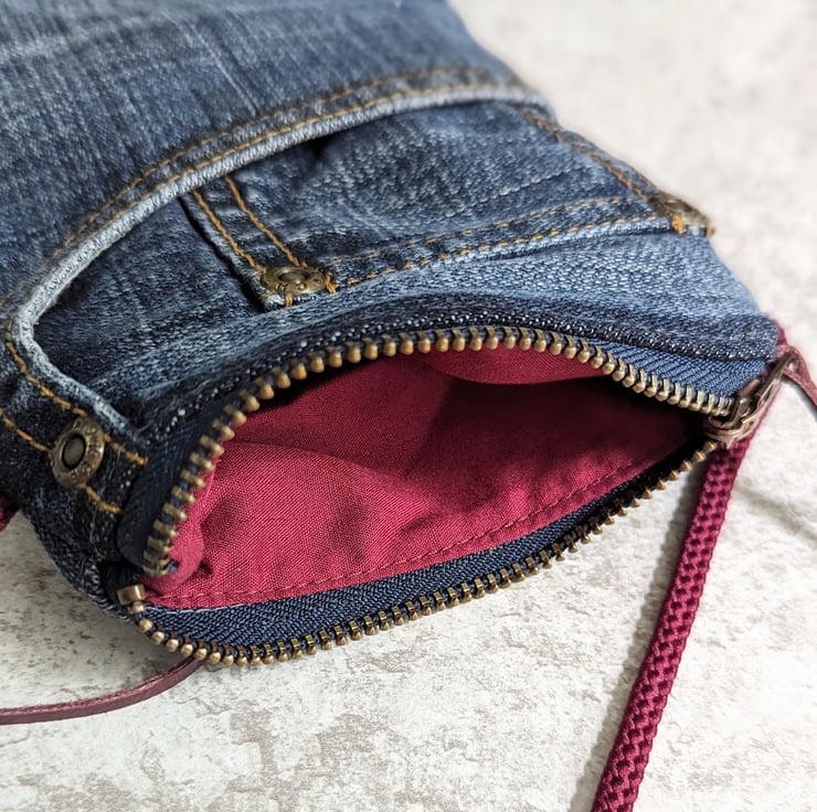 The opening is zipped - both zips have been reclaimed from denim jeans and have added burgundy leather zip pulls.
