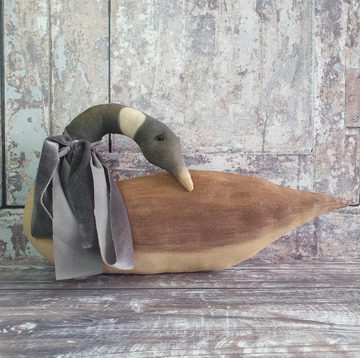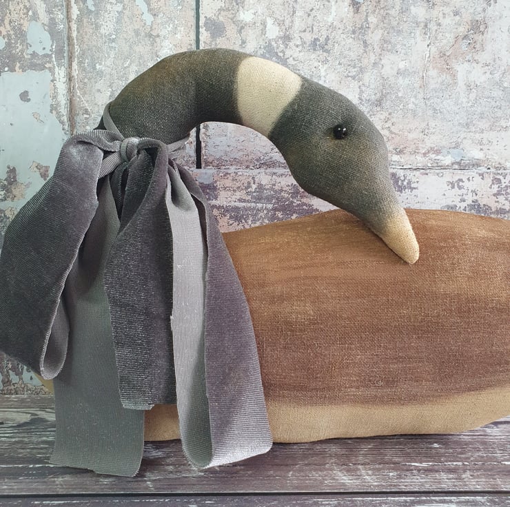 This lovely large primitive style Canada goose has been made out of painted fabric. I age my fabric first with coffee, cinnamon and vanilla. They are then painted with acrylic paints and once dried are sanded own. This gives them an aged wooden look. Around her neck has been tied a handmade grey velvet ribbon. Before they are posted to their new home they are given a generous dusting of cinnamon so they smell lovely upon arrival. She will look great in your home all year round.