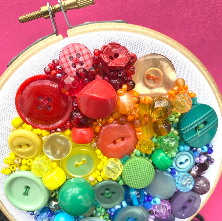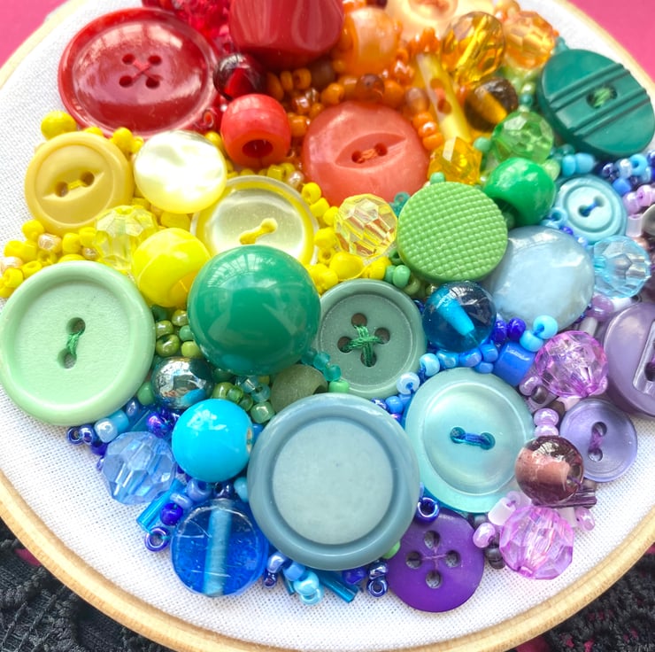 This colourful rainbow inspired hoop is made up of hundreds of beads, buttons and sequins carefully hand sewn in rainbow order. The background is white background with a natural wooden hoop.
