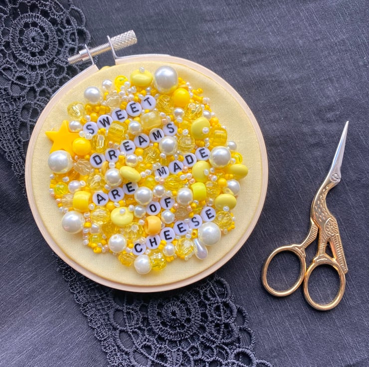 This yellow hoop has a range of yellow and pearl coloured beads surrounding a quote ‘ Sweet Dreams Are Made Of Cheese’ . Perfect for cheese lovers.