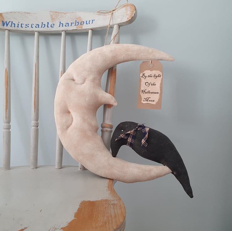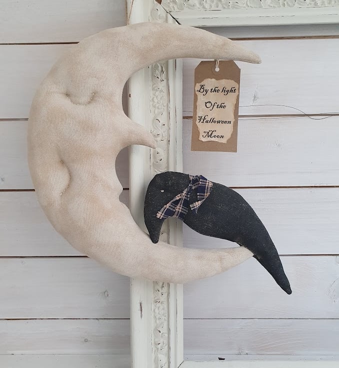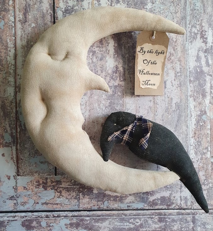 This primitive Halloween moon is a great addition to your Halloween decor. He has been made out of painted fabric. I first age my fabric with coffee, cinnamon and vanilla. He has then been painted with acrylic paint and once dried sanded down to give him an aged, worn look. His features have been handstitched. I have also attached a crow that has been aged too and a label which says "By the light of the Halloween Moon". Before they are posted to their new home they will be given a generous dusting of cinnamon so they will smell lovely upon arrival.